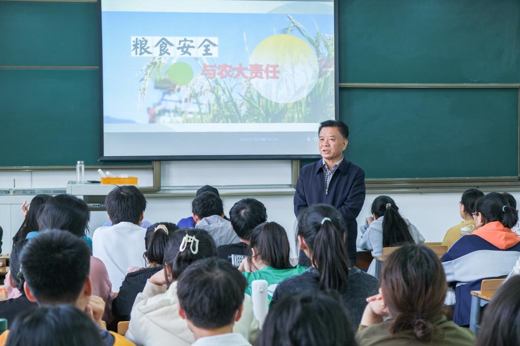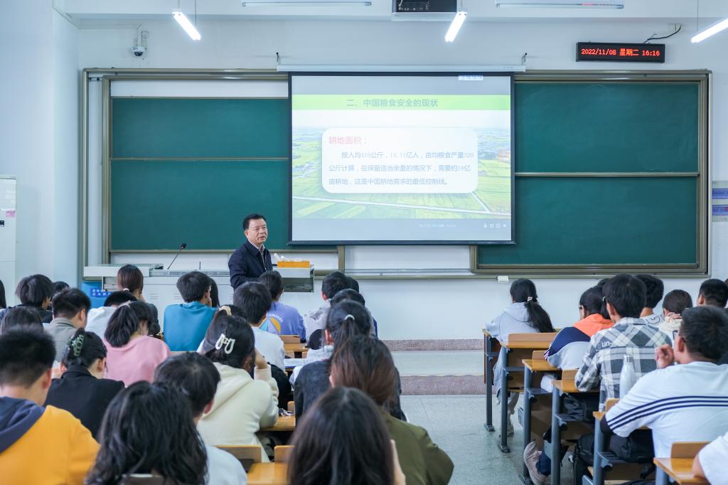118日下午,校党委副书记、副校长姚江林为我院2022级学生讲授形势政策课。姚江林以“粮食安全与农大责任”为题,围绕粮食安全的内涵、中国粮食安全的现状、粮食安全面对的危机、中国农业科技创新现状以及农大学子的责任和使命五个部分进行讲述。