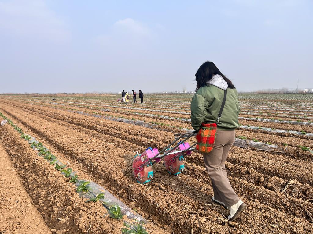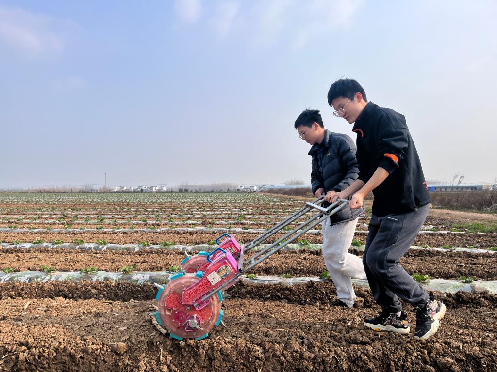当同学们见到手扶式半自动玉米播种机时,纷纷下地进行了耕作体验。当粉红色的播种机走在田垄上,不疾不徐地均匀洒下包衣玉米种时,实践队队长牛梓萌笑着讲道:“机器播种就是又快又好,即能做到高效,也能保证高质量。真正走进田间地头,看到我们所学的知识在生产实践中的运用,农科学子的成就感油然而生。希望我们在未来的科研与实践中,能够学有所长、学有所重,切实推进产业发展、助力乡村振兴。”