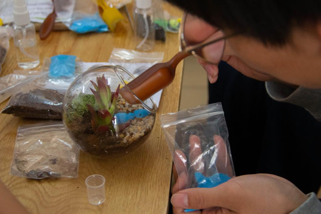 4月9日下午,植科院邀请资环院学生会以“瓶纳百川,共护生态”为主题于荟七三楼活动室展开生态瓶制作活动。“利用一包沙、几抔营养土、几株多肉等材料构建一个生态秘境是令人向往的”,活动在轻松愉快的氛围中开展,同学们在亲自动手装点搭配、制作生态瓶的同时,不仅详细了解了各种材料的作用,更学会了人工构建生态系统的相关知识。农学2001班王丹阳感慨道:“这次活动在让我感受到小小的生态瓶中蕴含着自然的深邃机理的同时,也令我的身心得到了放松。”