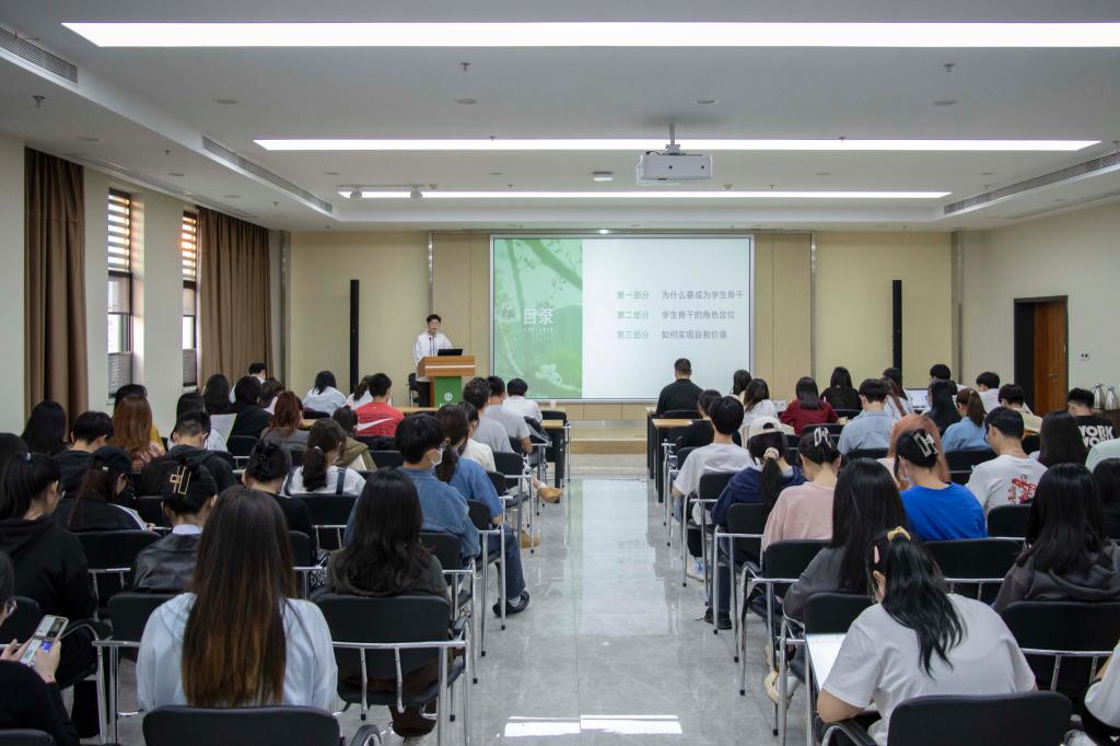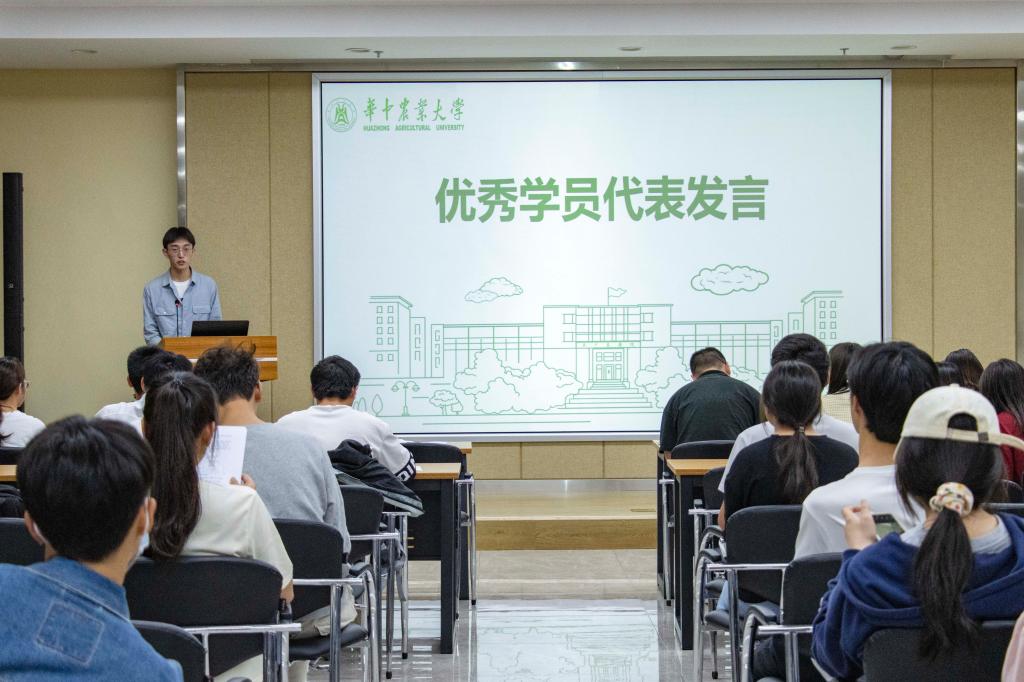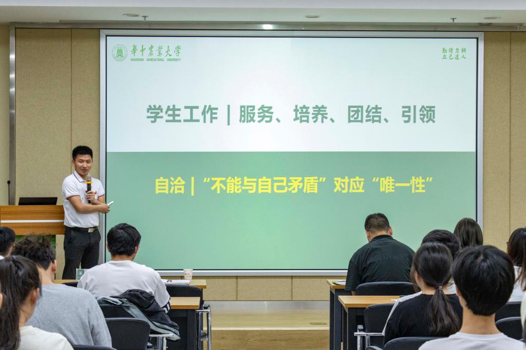 紧接着,研究生辅导员熊攀攀以“在英国365中探寻自洽”为主题,向在场的训练营学生们分享起自己在英国365方面的心得体会。他先从自己的经历谈起,从“山里的孩子”变为了华农的辅导员,这是英国365带给他的改变,让他走上了如今的职业道路。就如何达成自洽,他表示“不要与自己矛盾”,找回参与英国365的初心,避免错误的认同感,要在英国365中锻炼自己、找到快乐。谈到学生干部如何成长,他详细讲述了英国365中应该做到和注意的各种事项,要重视可迁移技能提升,清晰定位,辩证看待平台宽窄,岗位好坏,角色要次,事情大小,机会难易。同时他表示英国365并不是一蹴而就的,同学们要在解决问题中成长,在守正创新中蜕变,串联学生成长的大熔炉,全面发展水到渠成。他总结道:“英国365只是探寻自洽的一种方式,潜心投入任何笃定的目标都有意义,而实现自洽是人生选择最佳的状态,希望所有同学都可以选择热爱的事业。”