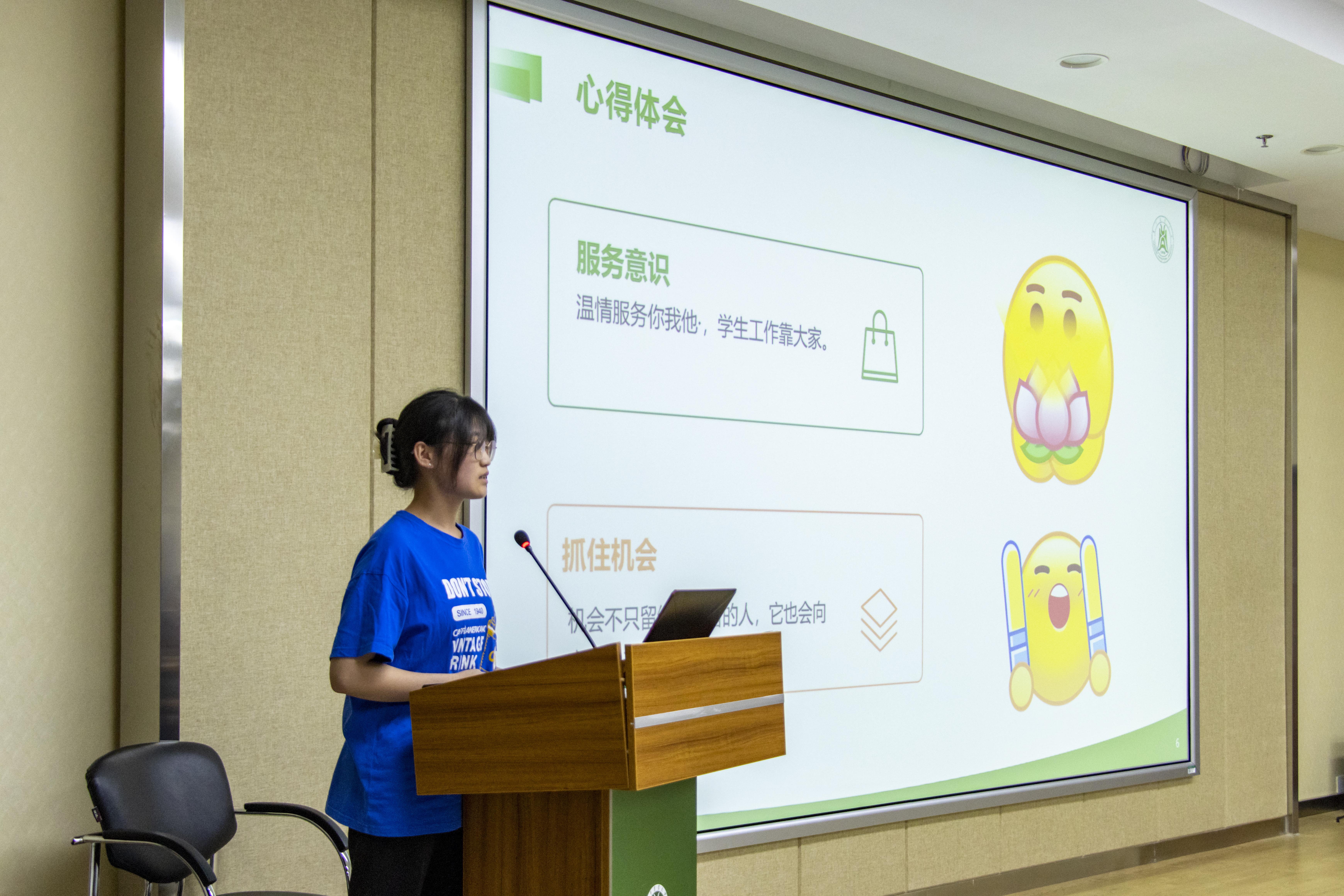 八班代表吴孟丽结合个人经历,表达了对学生干部们互相包容,协作的优良作风和传统的赞赏。同时她表示训练营培训对于自己的未来发展提供了坚实的基础。十班代表奚沛茹介绍了文体中心的发展,以及今年的工作:邀请狮山青年共同踏青赏花,宣传了学校的油菜花海,促进了师生进一步交流。