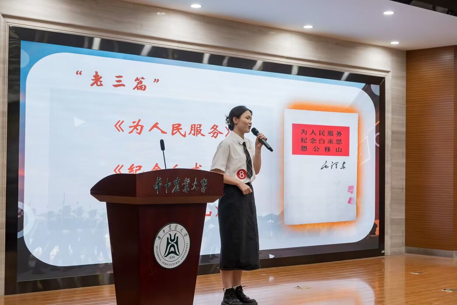 舒娜以“重温老三篇,坚持以人民为中心”为主题,深入解读了老三篇背后的精神——“全心全意为人民服务地无私奉献精神” “毫不利己专门利人的共产主义精神” “不怕牺牲奋斗到底的革命精神”,并将华农学子以青春力量践行老三篇背后的精神的动人故事娓娓道来。演讲层次丰富、内容充实。