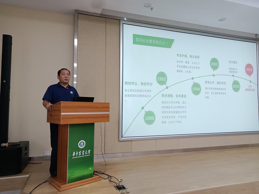 “热烈欢迎远道而来的家长朋友们”,朱龙付首先向现场家长致以问候。他向家长们介绍了学院的院史院情。他谈到,学院与学校“同岁”。从1898年湖北农务学院创立至今,已有125周年办学历史。学院在不断发展的过程中,汇聚英才,涌现出以傅廷栋院士为代表的大批杰出科学家和科研工作者们,拥有雄厚的师资力量和科研实力。同时,学院注重学科建设和人才培养,立足中国农业发展,探索农科专业建设新思路,成立全国首个智慧农业书院,以“1+N+X”模式培育新农科人才。“学院在资助育人、本科生升学就业等方面做了诸多尝试和努力”,朱龙付详细介绍了学校助学贷款、奖助学金及就业升学前景等情况,回答家长们关心关切的问题。他也向家长们阐述学院的发展愿景:即建成国际一流现代农业人才培养高地、建成国际一流科技创新高地、建成国际一流的社会服务高地、建成国际一流的科技合作与文化传播高地。