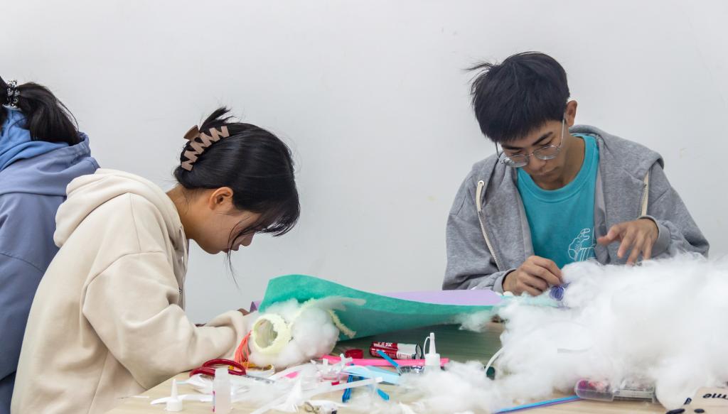 在对棉花有系统的理解后,创“艺”绵棉活动中同学们走进田间地头去采摘棉花,体验棉花的多样用途。同学们在棉花植株中来回穿梭,他们或将脸庞凑近细闻棉花有无香味,或轻轻捧起棉花细细观察,亦或用手轻轻触摸感受棉花的质感,眼中满是对棉花的好奇。随后在种子挂藏室104教室内,同学们以洁白的棉花、瓶子、不织布、卡纸、灯串等为原材料制作云朵灯,以棉花为砖瓦,聚精会神,一点一点堆砌着自己的棉花云朵灯。植生2306班代云翼表示:“在制作云朵灯时,我从眼花缭乱、无从下手,到得到工作人员指导后的得心应手,我学到怎样处理大团蓬松的棉花,体会到棉花带给人的奇思妙想。制作完成后,打开小夜灯,云朵灯就像软软的云朵发着光,心中充盈着成功的喜悦。”