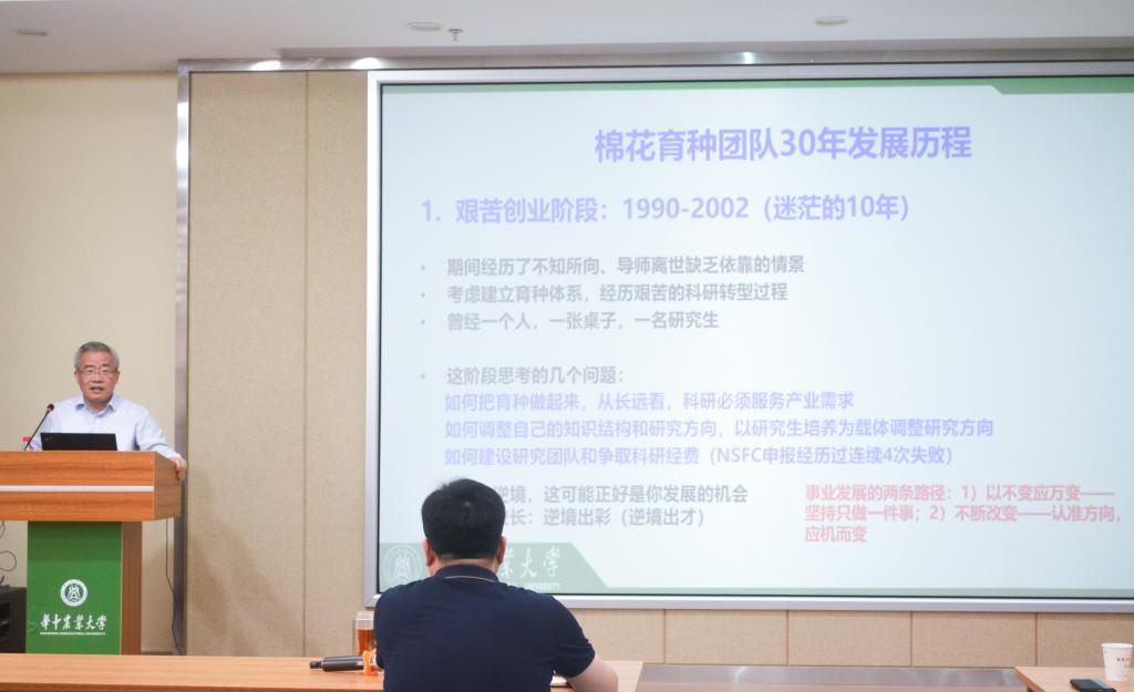 “年龄不能限制创新,创新的关键在于激情。”回顾自身三十年奋斗历程,张献龙认为奋斗的意义在于教育人才,在于自我超越和不断创新。展望未来,张献龙表示,棉花育种团队将以“上天”和“入地”作发展布局,形成岗位互动的技术链和人才链,通过凝练重大科学理论问题,育成重大品种,突破育种技术瓶颈、基因瓶颈、基因组育种瓶颈和种质资源转化瓶颈等“卡脖子”技术创新。最后,他以“幸福都是奋斗出来的”与教职工共勉,激励大家不断奋斗,做“顶天”“立地”的科学研究。