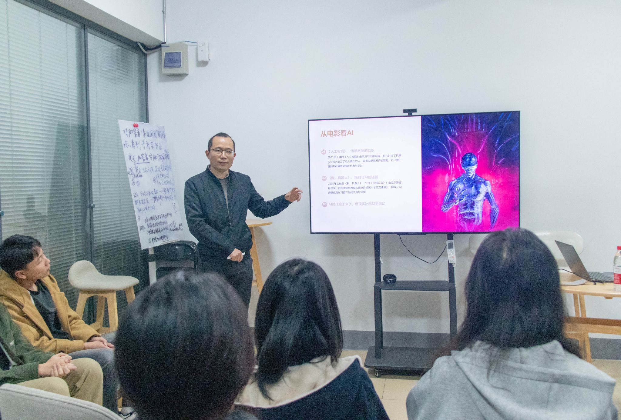 活动伊始,张振宇从人工智能的概念切入,通过解析《人工智能》《我,机器人》等经典影片,阐释AI技术的核心要义。他指出:"当前AI技术革命已进入爆发期,正深刻重构医疗、交通等领域的发展格局。AI与人类的关系处于动态演变中,从最初的人类创造AI,到AI辅助人类,再到未来可能的共治关系,我们需要提前思考与AI的相处之道。"