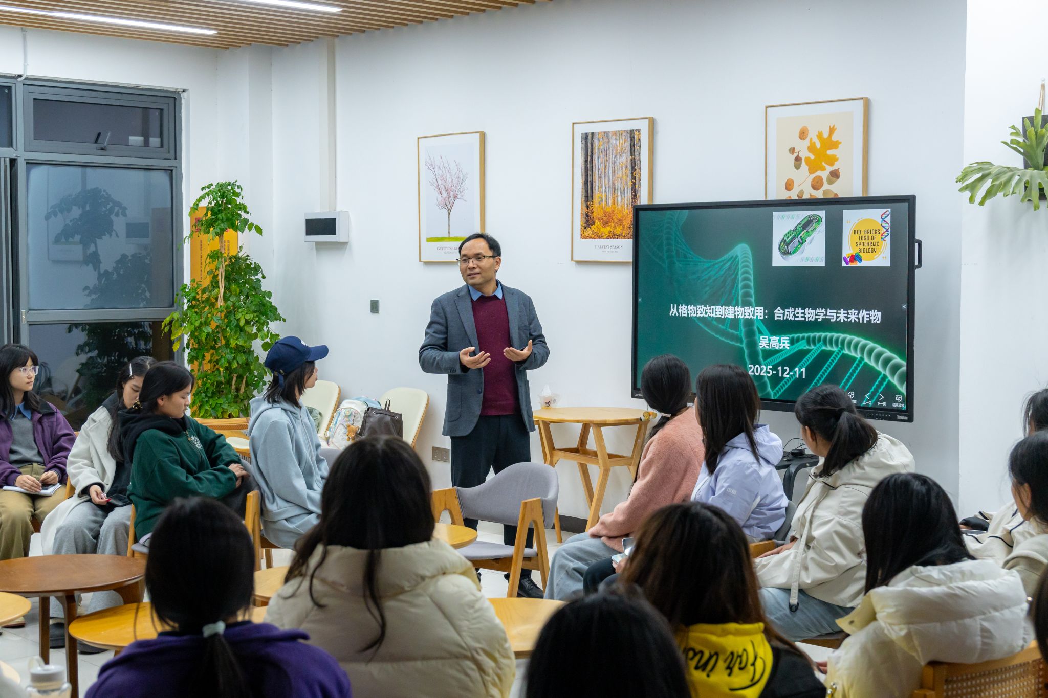12月11日晚,第344期“问学斋”学术活动在学生综合楼103室顺利举办。学院副教授吴高兵受邀担任主讲嘉宾,以“格物致知,造物致用”为核心主旨,结合自身合成生物学与未来作物设计核心研究方向,为现场学子带来一场兼具学术深度、专业精度与发展前瞻性的知识盛宴,助力学子拓宽学术视野、明晰科研方向。