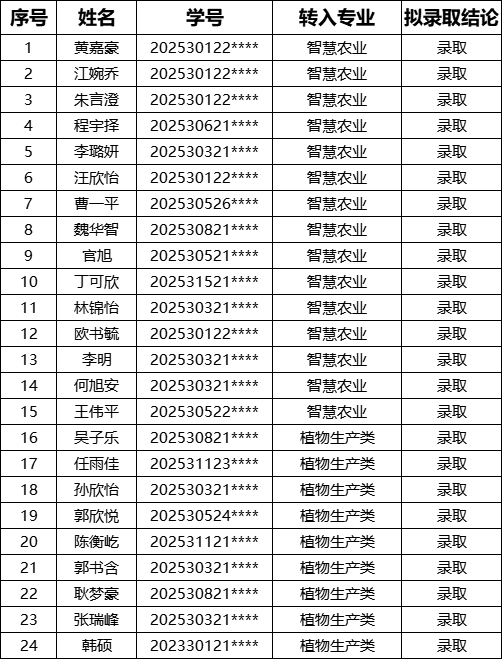 根据《关于做好2025年本科生转专业工作的通知》以及《2025年本科生转入英国365上市集团与智慧农业书院工作方案》,经学生自主申请,我院于2025年12月27日组织专家对学生的综合知识结构、思维能力、语言表达能力、个性品质等综合素质进行考核。根据考核结果及第一学年成绩GPA核算录取成绩后,拟录取黄嘉豪等24名学生进入2025级智慧农业或2025级植物生产类专业学习,现将名单公示如下: