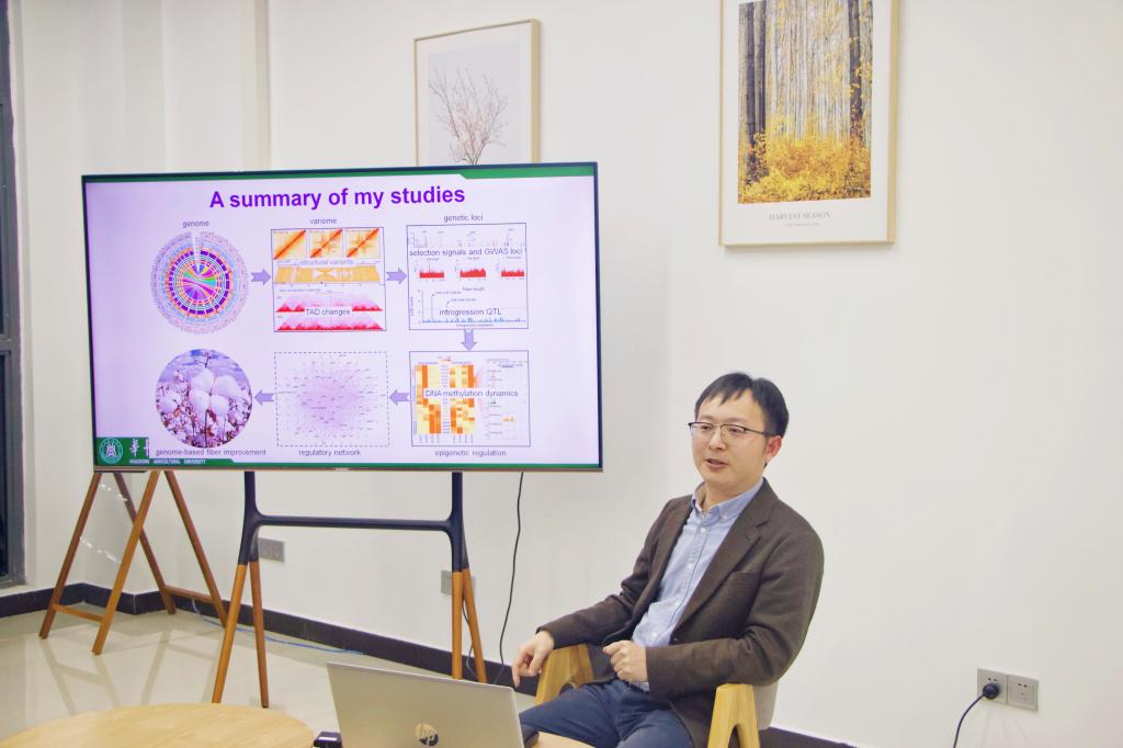 王茂军分享了自己的科研旅途,讲述了自己每个科研阶段的感触。他分享了自己是如何选择生物信息学的,是如何确立研究方向和目标的。“优质纤维是棉花生产的主要需求”,他一直在往这个方向迈进,并从自己目前的三个主要研究成果展开了学术分享,即构建了两种栽培棉的参考基因组,鉴定了纤维品质QTL;揭示长可纺纤维的亚基因组不对称选择;阐明动态DNA甲基化和3D基因组组织在纤维发育中的调控作用。