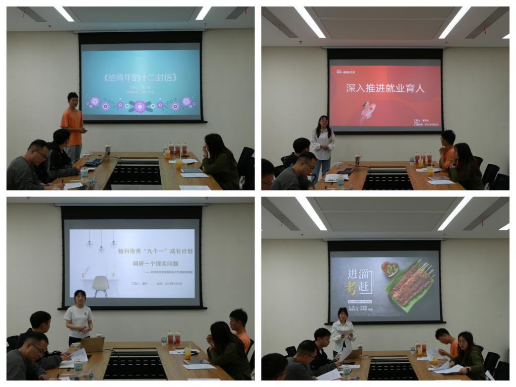 汇报结束后,刘涵斐、肖晗两位老师对大家的表现进行了集中点评。刘涵斐老师对大家的表现表示肯定,他谈到“每位同学分享的内容都和学院日常的工作息息相关,九个一是一个思维碰撞和相互学习的好机会,大家要把握当下,培养在工作中争先示范的意识。”肖晗老师指出,在研究生工作中,要用研究型思维开展研究型工作,要牢记习近平总书记提出的不断加强脚力、眼力、脑力、笔力的工作要求,提升自身本领,扎实耕好工作中的责任田。