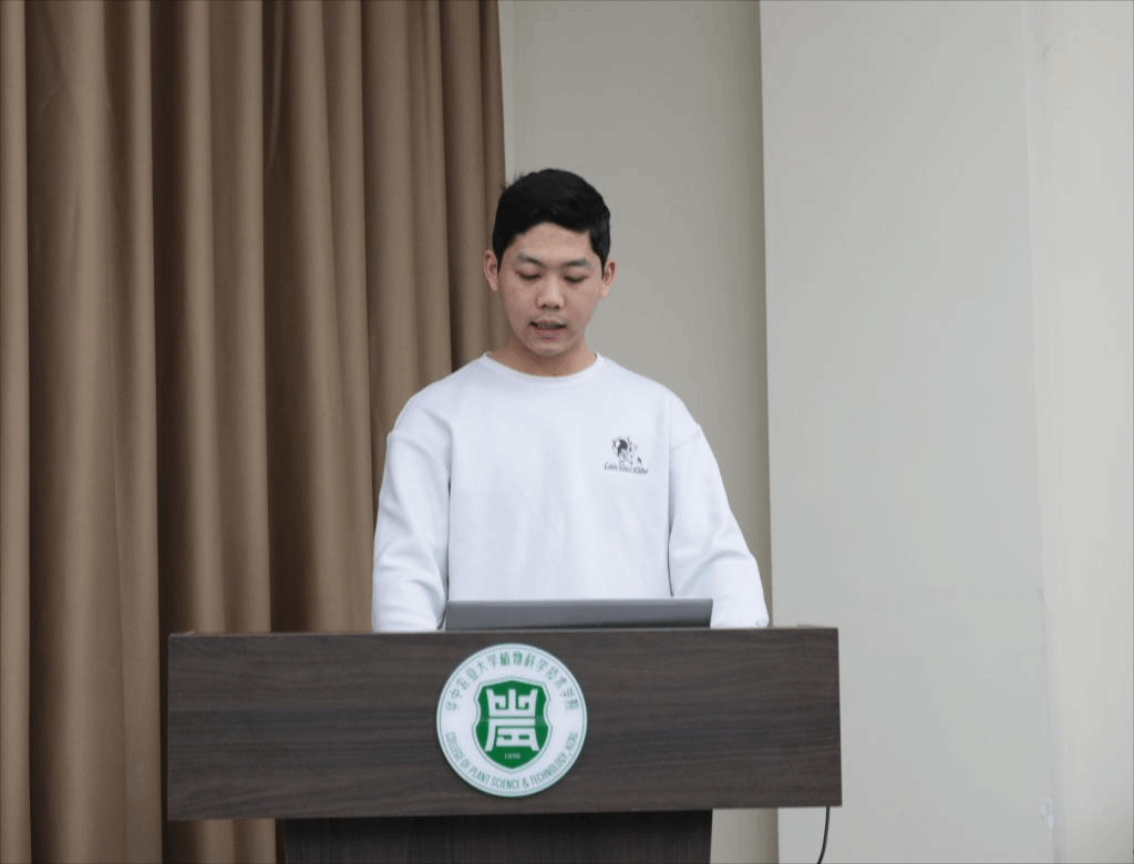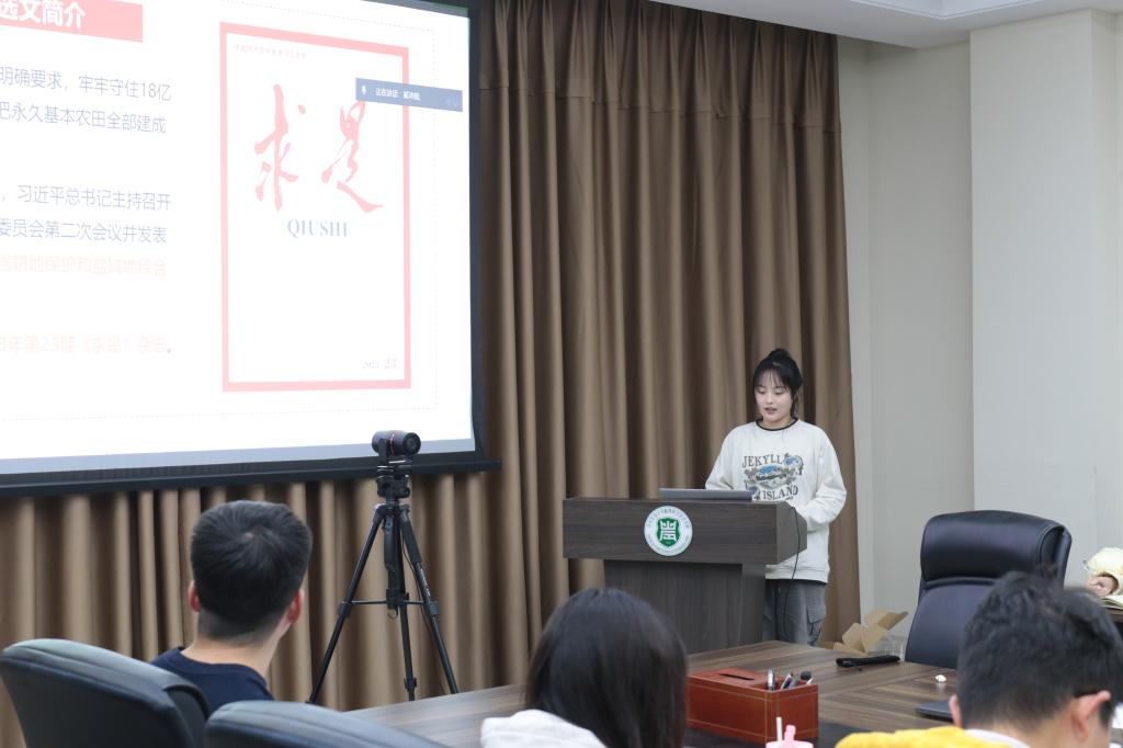 田欣雨就《求是》杂志文章《切实加强耕地保护 抓好盐碱地综合改造利用》,从基本内涵、理论内核和心得体会三个方面展开理论学习汇报。呼吁农科学子将个人的理想和国家发展需要相结合,想国家之所想、急国家之所急、应国家之所需,做一个有思想、有准备、有目标的高素质新时代研究生。