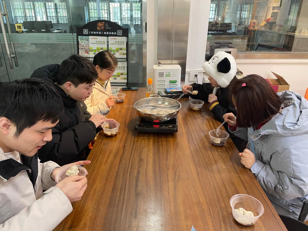 2月9日除夕夜,留校工作负责人在三综问学咖啡厅提前为同学们准备好需要的食材,伴着阵阵香味,热气腾腾的饺子和汤圆便出锅啦!大家一起品尝着香气四溢、汤汁鲜美的饺子,一边聊着日常,不时分享包饺子的技巧和家乡过年的习俗,交流生活趣事,充满着“家”的味道和温暖。饺子虽小,但传递着关怀和温暖,同时饺子又名“弯弯顺”,寓意万事顺顺利利,祝愿同学们在新的一年实验顺顺利利,生活顺顺利利。
