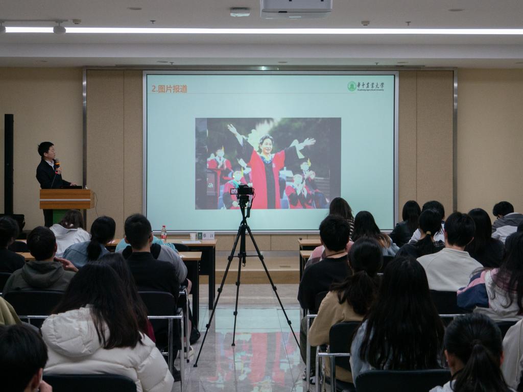开班仪式结束后,晏华华作“融媒体时代学院宣传工作如何破圈出彩”的培训分享,他从学院宣传常用的文字、图片和视频三个方面进行了分享。在文字方面,晏华华以多年的工作经验,展示了在采访中的入手方向、指标体系等要点,同时指出了常见的写作问题。他指出,在学院宣传工作中的稿件应展现人物精神风貌,刻画人物粗细相搭,风格也要做到片段式呈现、冲突式设计和文学性表达的有机结合。在图片方面,晏华华借助生动的新闻图片实例,强调了不同新闻摄影构图的景别内涵,对新闻图片中的视角等细节提出了独到的见解。在视频方面,晏华华结合近年来我校系列热门视频,将选题的关键浓缩为“人物+现场+情感”的组合,强调同学们生活中多发掘“新奇特优趣”的素材,搭配合适有吸引力的介绍,从而创作出出圈视频。