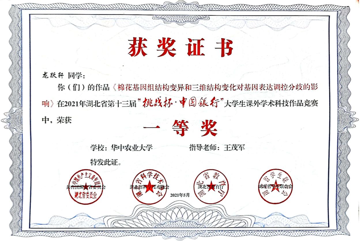 据悉,龙跃轩同学于大二上学期进入棉花遗传改良团队学习。在导师王茂军教授的鼓励与指导下,开展创新性的课题研究。龙跃轩多次在小组组会上汇报进展,还在小组举办的学术沙龙活动中向研究生讲解领域内高水平研究论文。疫情期间,王茂军也不忘关心本科生的科研进展,多次在线上指导本科生的科研工作。在这种高强度的锻炼下,龙跃轩从生物信息学零基础到现在文章的发表仅仅用了不到两年的时间。除此之外,王茂军还鼓励学生参加课外学术竞赛。2021年,在他的指导下,龙跃轩的作品“棉花基因组结构变异和三维结构变化对基因表达调控分歧的影响”在校赛、省级预赛和省级决赛中脱颖而出,最终获得了英国365集团第十三届“神农杯”大学生课外学术科技作品竞赛特等奖和湖北省 “挑战杯”大学生课外学术作品竞赛一等奖的成绩(图2),目前已入围国赛且正在备战。