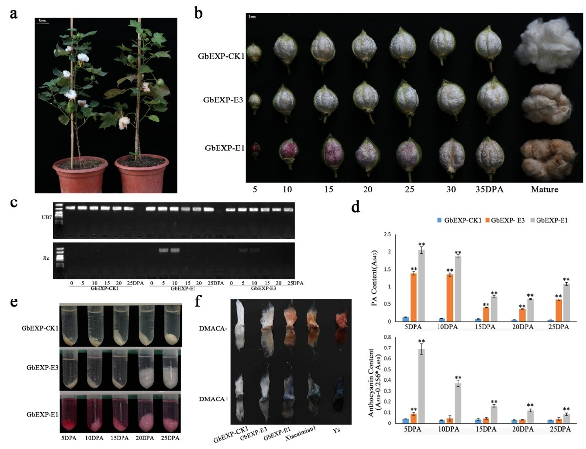 通过纤维特异表达启动子GbEXPA2的驱动,研究团队成功地得到在开花后5-10 天的纤维中高量特异表达Re的转化材料,并获得植株正常绿色而发育中的纤维呈紫红色的转化系。但随着纤维的发育,紫红色逐渐变浅,最终的成熟纤维呈现出不同程度深浅的棕色。通过检测纤维中原花色素(PA)与花青素的含量,PA的大量积累是成熟纤维呈棕色的主要原因。