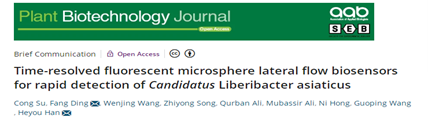 2022年6月,我院丁芳副教授联合理学院韩鹤友教授为共同通讯,在国际学术期刊Plant biotechnology Journal发表了题为“Time-resolved fluorescent microsphere lateral flow biosensors for rapid detection of Candidatus Liberibacter asiaticus”一文,该研究首次建立了靶向柑橘黄龙病菌外膜蛋白的时间分辨荧光微球试纸条传感器检测技术,以Mab DF1单抗修饰的荧光微球作为信号标签,通过检测线上的多抗捕获病原,在紫外光激发下显示荧光条带,从而快速判断待检测样品是否为阳性,该方法可以实现对黄龙病菌Omp CLas 膜蛋白的精确定量及可视化检测。