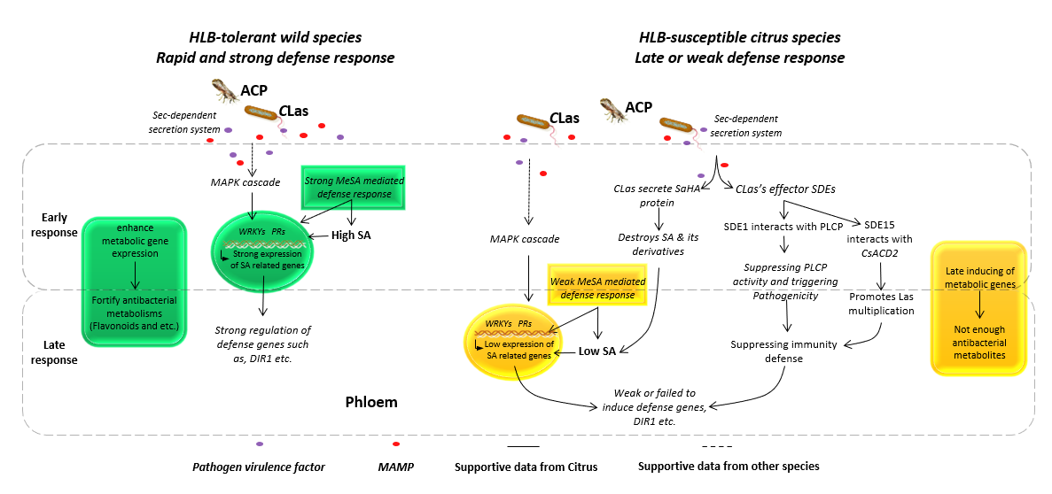 2021年12月,丁芳副教授、美国佛罗里达大学CREC Wang Nian教授、我校园艺林学学院徐强教授为共同通讯作者,在国际学术期刊PLoS Pathogens 发表了题为“Molecular signatures between citrus and Candidatus Liberibacter asiaticus”一文,该文从黄龙病菌基因组特点及可能的致病因子入手,系统论述了黄龙病菌致病分子机制,并从柑橘转录组学、蛋白质组学及代谢组学方面论述了黄龙病菌参与致病及其与柑橘寄主互作的特点,指明了未来柑橘黄龙病研究的重点方向,特别是柑橘抗/耐病资源挖掘、免疫调控和遗传改良等方面。