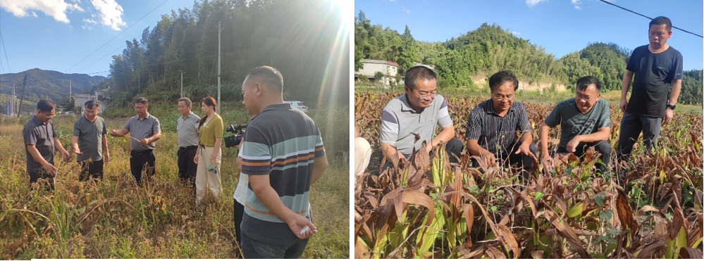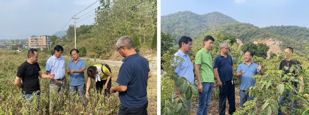 专家实地查看野菊花(左)和吴茱萸(右)生产基地受旱情况