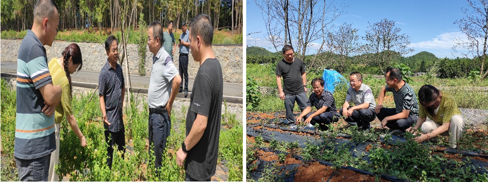 专家实地查看崇阳县“中药材三产融合产业园”金银花(左)、菊花(右)生产基地的抗旱减灾情况