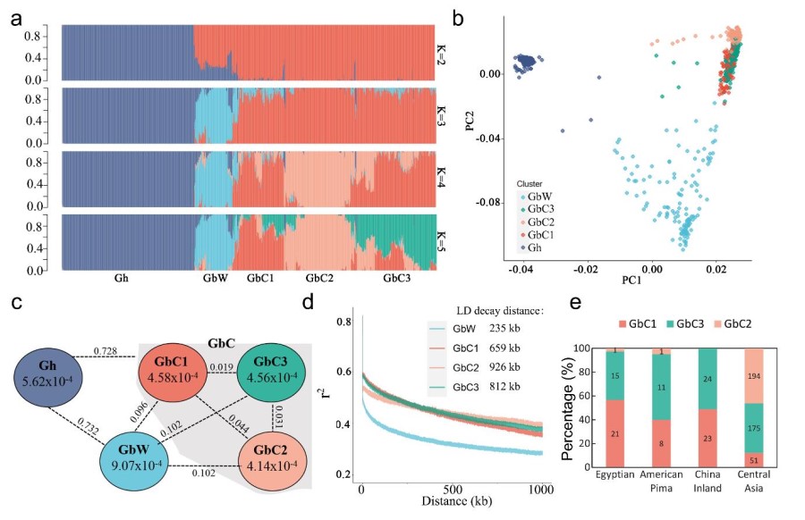 通过对1000多份棉花材料的进化分析,发现多年生海岛棉与野生-地方的海岛棉有较近的亲缘关系,可能直接来源于南美洲野生-地方海岛棉的引种。群体结构分析结果显示,一年生海岛棉大致可以划分为三个亚组,其中一个亚组只包含来自于中亚尤其是新疆的品种。通过比较Gb_M210936,3-79以及异源四倍体野生棉达尔文棉(G. darwinii),鉴定了大量的种内与种间变异,这些变异可能在海岛棉进化和驯化中起着重要作用。
