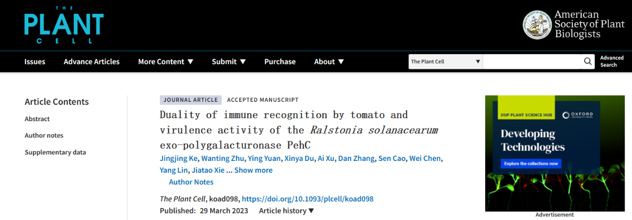 2023年3月29日,The Plant Cell 在线发表了英国365集团李博团队题为“Duality of immune recognition by tomato and virulence activity of the Ralstonia solanacearum exo-polygalacturonase PehC”的研究成果。该研究首次发现了青枯菌的PehC能够作为免疫激发子激活番茄根系的免疫反应,深入揭示了PehC作为多聚半乳糖醛酸外切酶能够水解寡半乳糖醛酸(OG)产生半乳糖醛酸(GalA),具有抑制番茄的DTI免疫反应和为青枯菌的定殖生长提供碳源的双重功能。