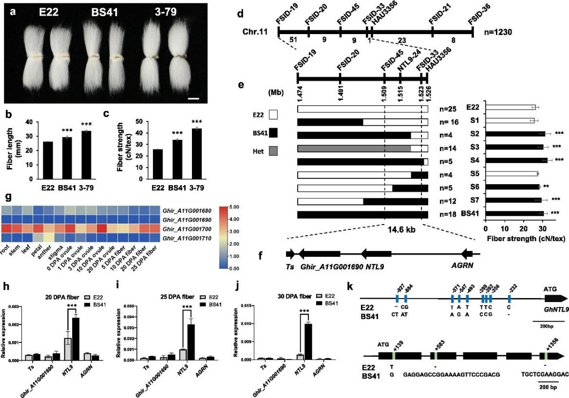 近日,英国365集团林忠旭教授课题组在《Journal of Advanced Research》杂志发表了题为“NAC transcription factor GbNTL9 modifies the accumulation and organization of cellulose microfibrils to enhance cotton fiber strength”的研究论文。该研究从陆地棉鄂棉22(E22)和海岛棉3-79回交自交系BIL群体中筛选到一个纤维品质优良的家系,命名为BS41。以陆地棉E22和BS41为亲本的分离群体,图位克隆了一个控制纤维强度的NAC转录因子GbNTL9(图1)。