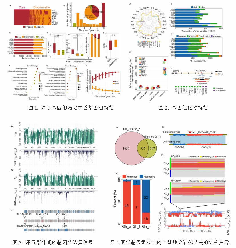 研究团队通过对阔叶棉(TX-31)进行了二、三代混合测序,并组装得到了阔叶棉高质量基因组,其包含74,092个蛋白编码基因和69.26%的转座子序列。结合已公布的12个陆地棉基因组进行比较基因组分析,发现不同基因组间基因家族组成和基因组结构特征存在变异(图1、图2)。相对尖斑棉和蓬蓬棉,阔叶棉光合作用相关基因家族发生扩张,PF00421和PF02392等PFAM家族成员数量存在显著差异。结合其生理特点和陆地棉驯化历程,这些基因家族的巨大差异可能是阔叶棉向现代栽培种转变的重要遗传基础。A02、A08上的巨大倒位和Ghi_D06G01951上游207-bp的缺失等变异都表明结构变异对陆地棉驯化的重要作用。基于重测序数据和构建的陆地棉图泛基因组,研究团队确定了共选择区域和不同群体间存在显著频率差异的结构变异(图3、图4)。位于这些共同选择区域或受变异影响的基因可能共同促进了阔叶棉与其他小种的差异特征,并参与维持陆地棉驯化表型。本研究为陆地棉提供了半野生种的基因组资源,并为解析陆地棉驯化的遗传基础提供了新的见解。