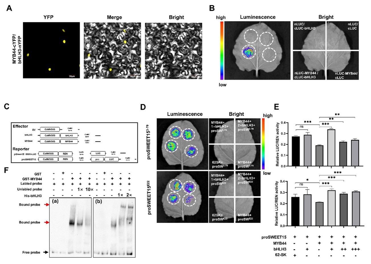 图2 bHLH3与MYB44互作削弱MYB44对SWEET15_A01的抑制效应