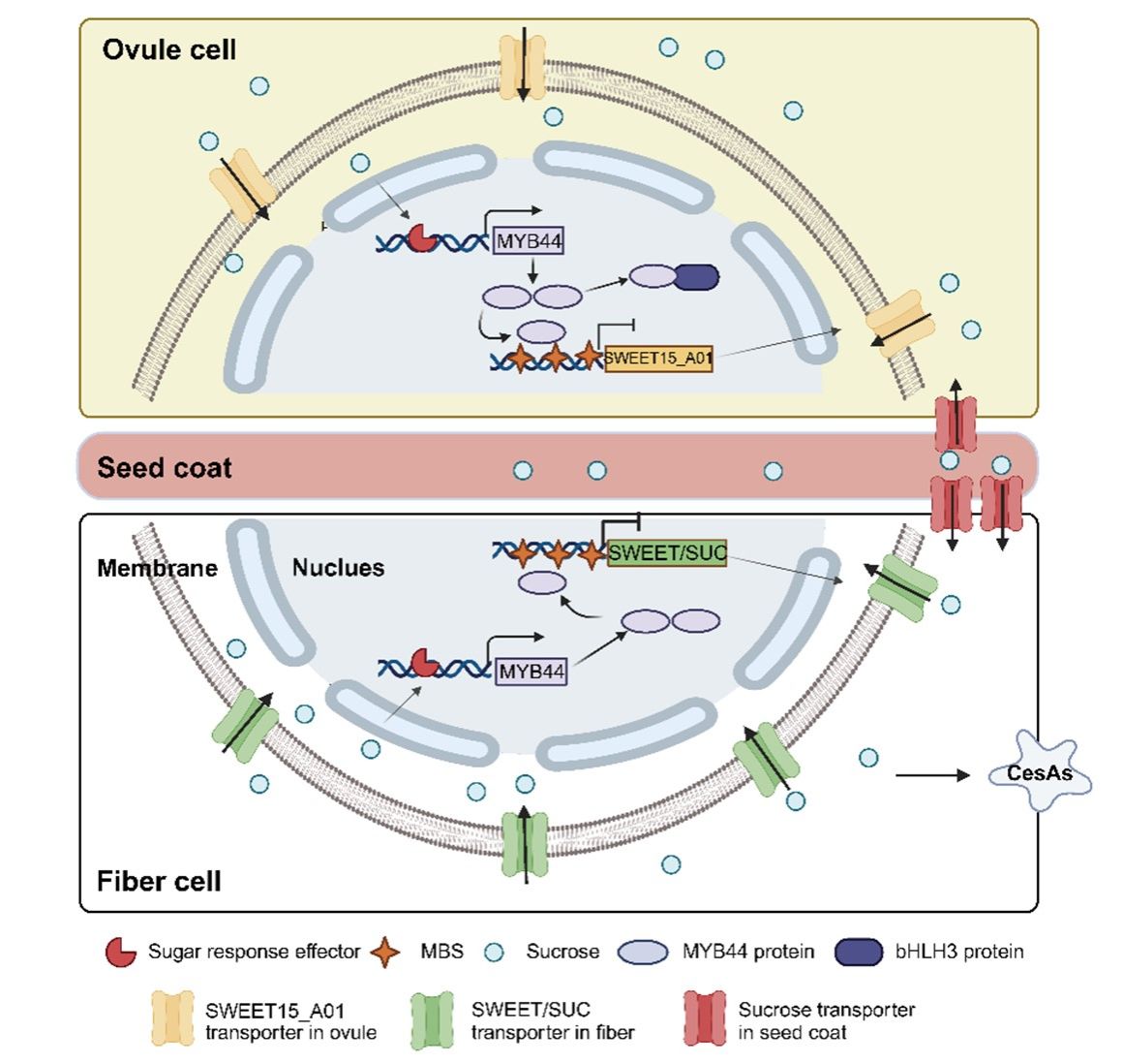 转录调控机制研究表明MYB44直接结合SWEET15_A01启动子并抑制其表达,而bHLH3可通过与MYB44形成蛋白复合体,从而削弱该抑制效应(图2)。超表达MYB44显著降低棉籽油分和种子大小,提高纤维长度。糖含量分析表明,15 DPA纤维中的高己糖/蔗糖比为纤维伸长提供充足能量,从而促进纤维伸长;25 DPA胚珠中的低蔗糖含量影响种子增大和棉籽油分的积累。MYB44在棉花发育后期通过抑制种子和纤维发育中的糖转运蛋白基因的表达,来调节糖在胚珠和纤维中的转运,以满足种子和纤维生长发育的需求。另外,蔗糖信号的变化反过来又会影响MYB44基因的表达,这种反馈调节机制使得棉花细胞能够根据自身的能量状况,灵活地调整MYB44的表达水平,进而调控种子和纤维发育。