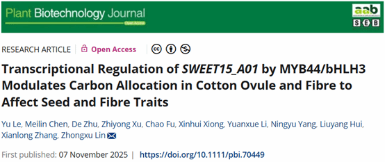 2025年11月8日,我院棉花遗传改良团队林忠旭教授课题组在Plant Biotechnology Journal期刊上在线发表了题为“Transcriptional Regulation of SWEET15_A01 by MYB44/bHLH3 Modulates Carbon Allocation in Cotton Ovule and Fibre to Affect Seed and Fibre Traits”的研究论文,揭示了MYB44/bHLH3-SWEET15_A01调节碳源在胚珠和纤维中的分配进而共同影响种子和纤维性状的分子机制。