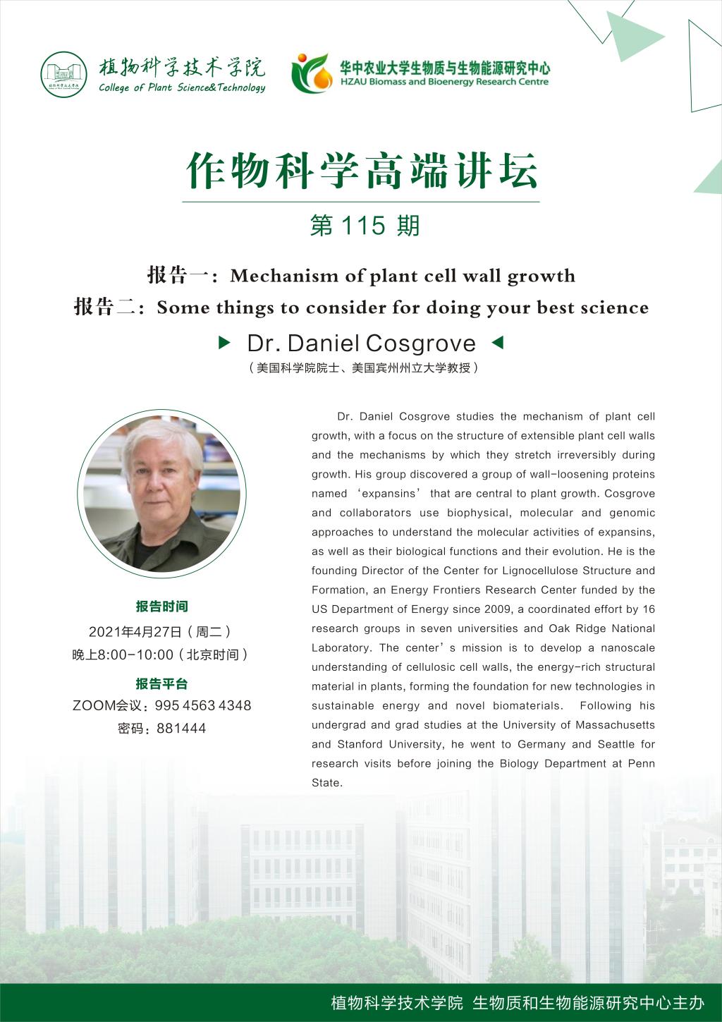 作物科学高端讲坛(Dr. Daniel Cosgrove)
