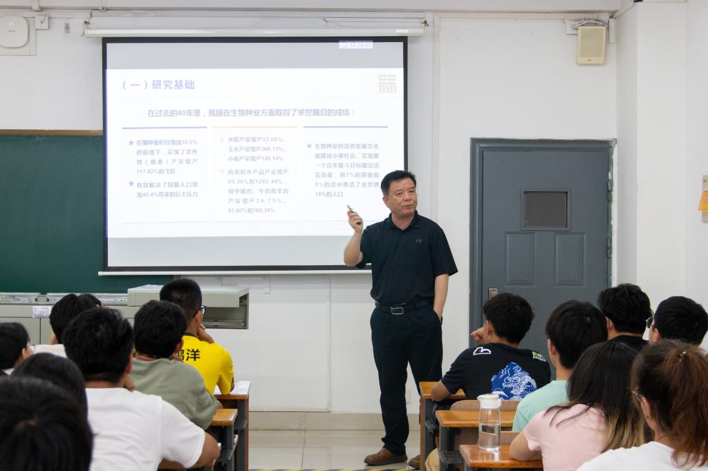 4月26日下午,校党委副书记、副校长姚江林在三教C204教室为植科院2021级学生讲授“粮食安全 国之大者”的形势政策课。