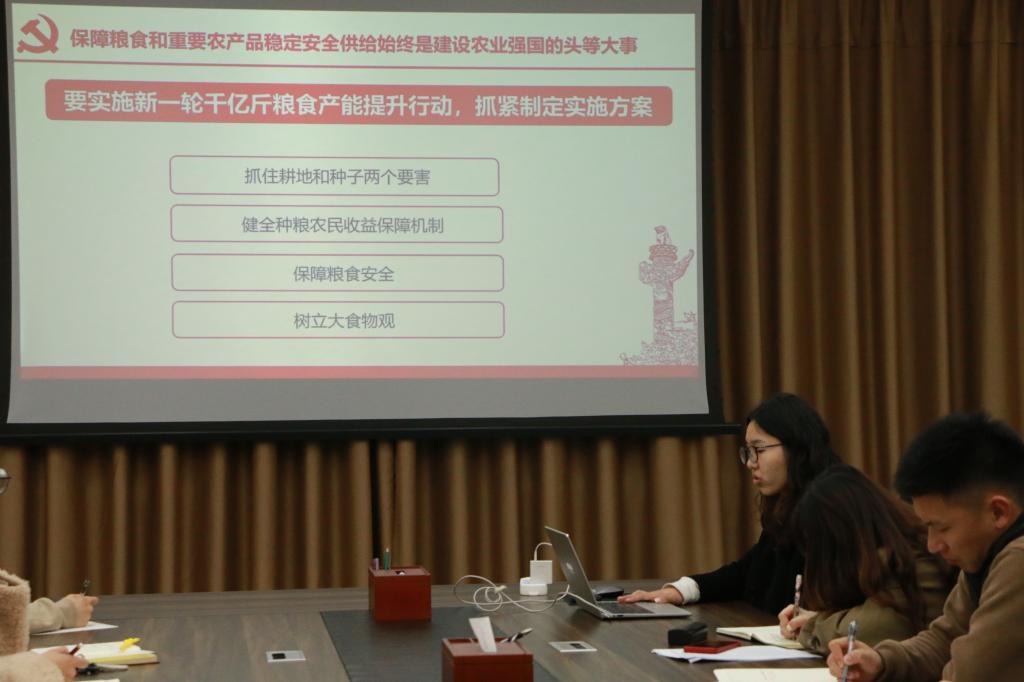 会议伊始,四位支部书记针对2月份的时事政治依次进行领学。育种第三党支部书记庄季昕就“习近平总书记在中央农村工作会议上的重要讲话”进行分享,她谈道:“华农95后硕士彭达发起‘菱辟蹊径,强农兴农——菱角全产业链赋能乡村振兴项目’,帮助农民增收致富,展现了作为农科学子应有的责任与担当”。育种第八党支部书记付超对2023年发布的中央1号文件进行领学,他认为:“作为党员的我们要紧密团结在以习近平同志为核心的党中央周围,坚定信心、踔厉奋发、埋头苦干,全面推进乡村振兴,加快建设农业强国,为全面建设社会主义现代化国家、全面推进中华民族伟大复兴作出新的贡献”。 农药专业党支部书记任志杰就“习近平总书记在中共中央政治局民主生活会上的重要讲话”展开领学。农昆第二党支部书记罗仁刚解读了“习近平总书记在学习贯彻党的二十大精神研讨班开班式上的重要讲话”的会议精神。