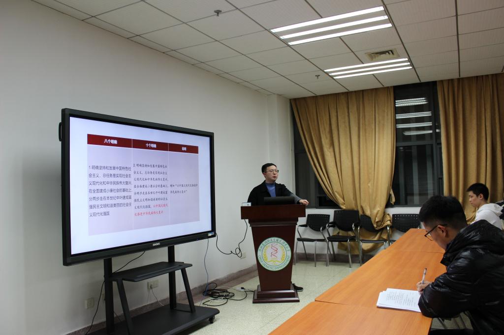 王茂军教授以大会主题中凝练的4个关键词为切入点展开分享,即旗帜、道路、精神和目标。“主义譬如一面旗子,旗子立起来了,大家才有所指望,才知所趋赴。”王茂军教授为同学们介绍了从十二大到十九大中“旗帜”——中国特色社会主义的革新。他表示:“旗帜决定方向,方向决定道路,道路决定命运。我们在新征程上应该举什么旗、走什么路关系到我们党和国家的未来。必须始终坚定不移高举中国特色社会主义伟大旗帜,锚定目标奋勇前进”。同时,要深刻把握核心要义和历史地位,十个明确、十四个坚持、十三个方面成就必须长期坚持并不断丰富发展;要深刻把握要两个‘行’,推进马克思主义中国化、时代化,以中国式现代化全面推进中华民族伟大复兴;要深刻把握决定性意义,深刻领悟‘两个确立’,坚决做到‘两个维护’”。
