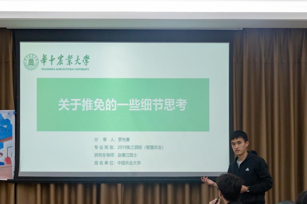 保研至中国农业大学的罗光春首先向大家介绍了他的基本情况,他强调道:“我的制胜秘诀是我寒暑假期间在相关专业公司的实习经历。”他建议大家在大学期间抓住各种机会,丰富个人实习和科研经历,“写在简历上的每一次经历都是面试官青睐于我们的机会。”