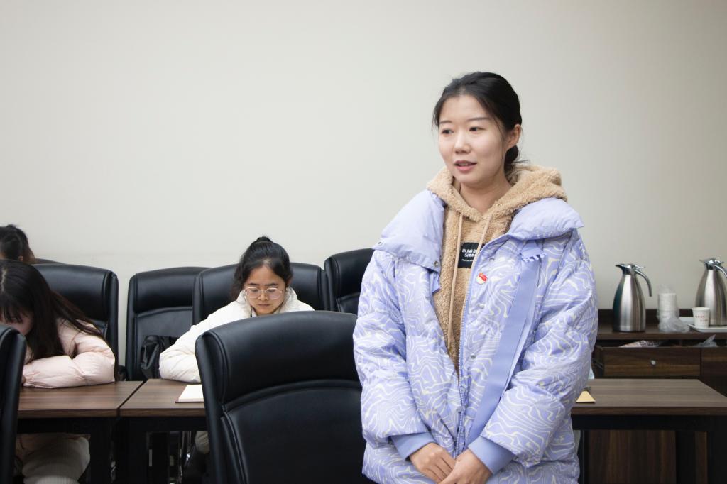 本科生党支部书记高婧雯就“再接再厉抓好灾后恢复重建确保广大人民群众安居乐业温暖过冬”进行领学。她指出返回北京前,习近平总书记对陪同人员和当地干部说,在党中央的正确决策部署下,各级各方面采取有力有效措施,把百年一遇的洪涝灾害损失降到了最低。灾后恢复重建涉及范围广,工程项目多,资金投入大。各级党委和政府、各有关部门要坚持求真务实、科学规划、合理布局,把资金用到刀刃上,高质量推进项目建设,把各项工程建设成为民心工程、优质工程、廉洁工程。高婧雯强调:“共产党是为人民服务的党,永远把老百姓放在心中最高位置,无论是抢险救灾还是灾后恢复重建,都会全力以赴。在党中央坚强领导下,只要大家齐心协力,就一定能够重建家园,过上更加美好的生活。”