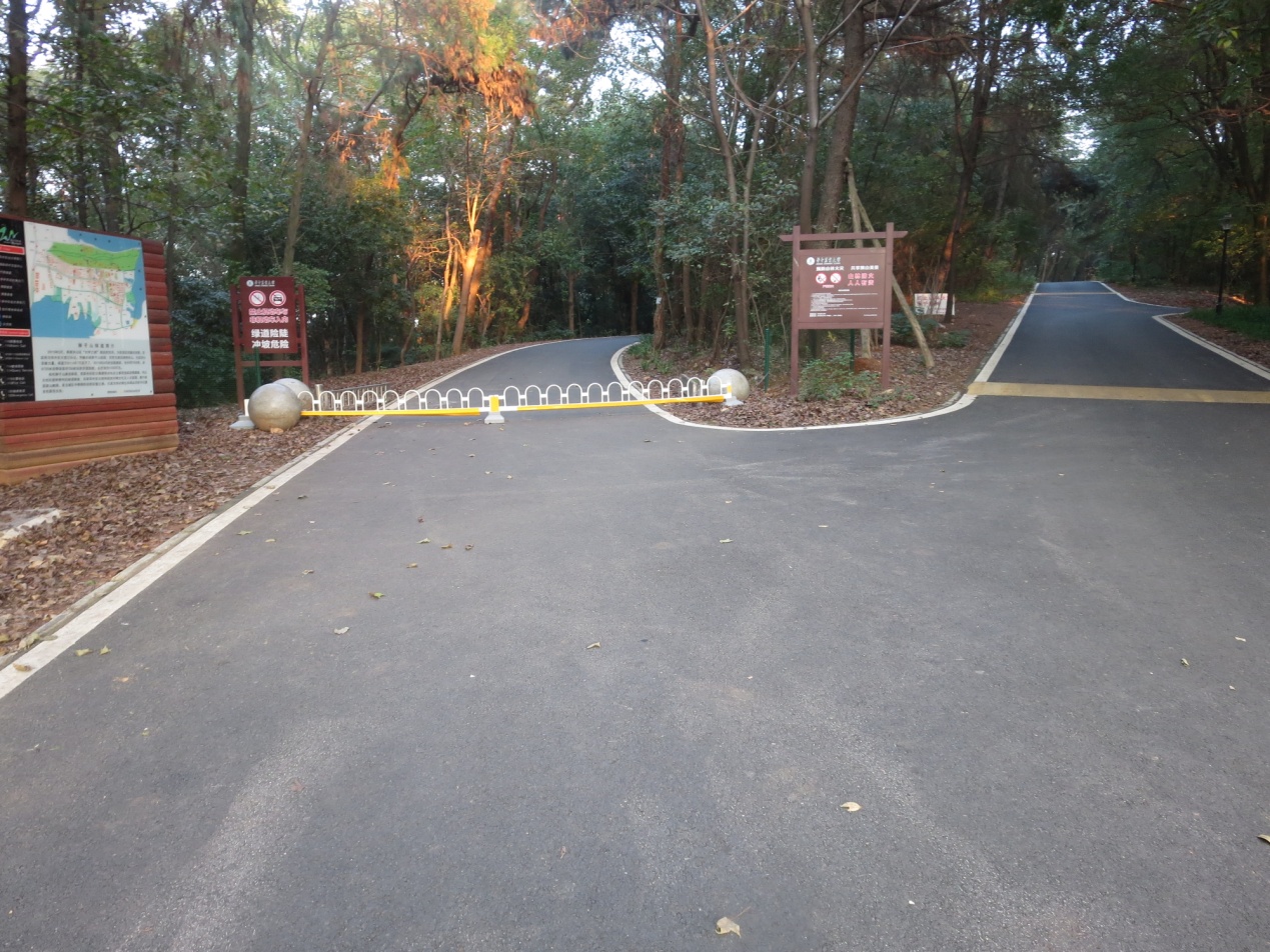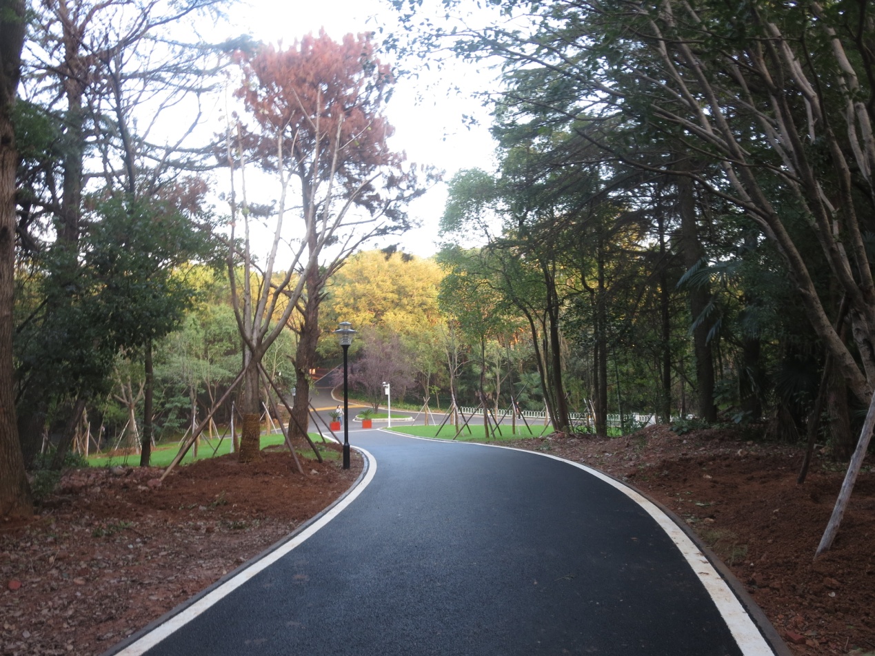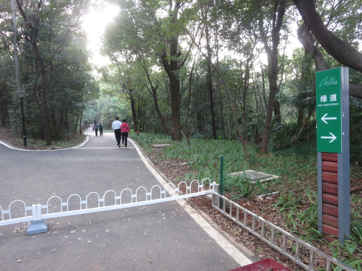 2002年,经教育部批准,兴建了山林防火通道,山顶山腰两条通道呈环状连接,弯弯曲曲九道弯,像蠕动的蚯蚓一般,引人入胜;2015年春,我多次沿着防火通道步行健身,但通道是狭窄的土路,坑洼不平,踢踢绊绊,行走不舒坦,下雨天,天黑了更是难行。于是我给学校写了一份建议书,希望学校从全校教职工学生的健身之需出发,在狮子山上修筑一条绿道。过了几个月,恰遇到了武汉市大力兴建步行绿道实施计划出台;2015年5月,乘着洪山区“大学之城”建设工程的东风,为促进区校融合发展,洪山区政府与华农大签定协议,确立区校共建狮山绿道工程。共同为建设美丽洪山、生态洪山贡献力量。绿道于2015年7月底动工,2016年8月初全线建成。绿道全长約7500米,由6720米沥青绿道和780米上下山台阶步道组成,命名为“狮山绿道”,并用草书雕刻于厐大巨石之上,放置于狮子山尾的绿道入口处。依山建成的绿道,是将原来的防火通道土路改造成了黑色沥清路面,宽度3米,道两边喷刷了白油漆线条,以示路标之美。绿道多是单线前行,但有两处依地形而建在山顶和半山腰的两条绿道呈环状连接。山腰地势平坦,供体力一般的中老年人使用,山顶绿道则有上坡下坡之路段,可供体力好的年轻人使用,有一种爬高和下坡的健身之乐。
