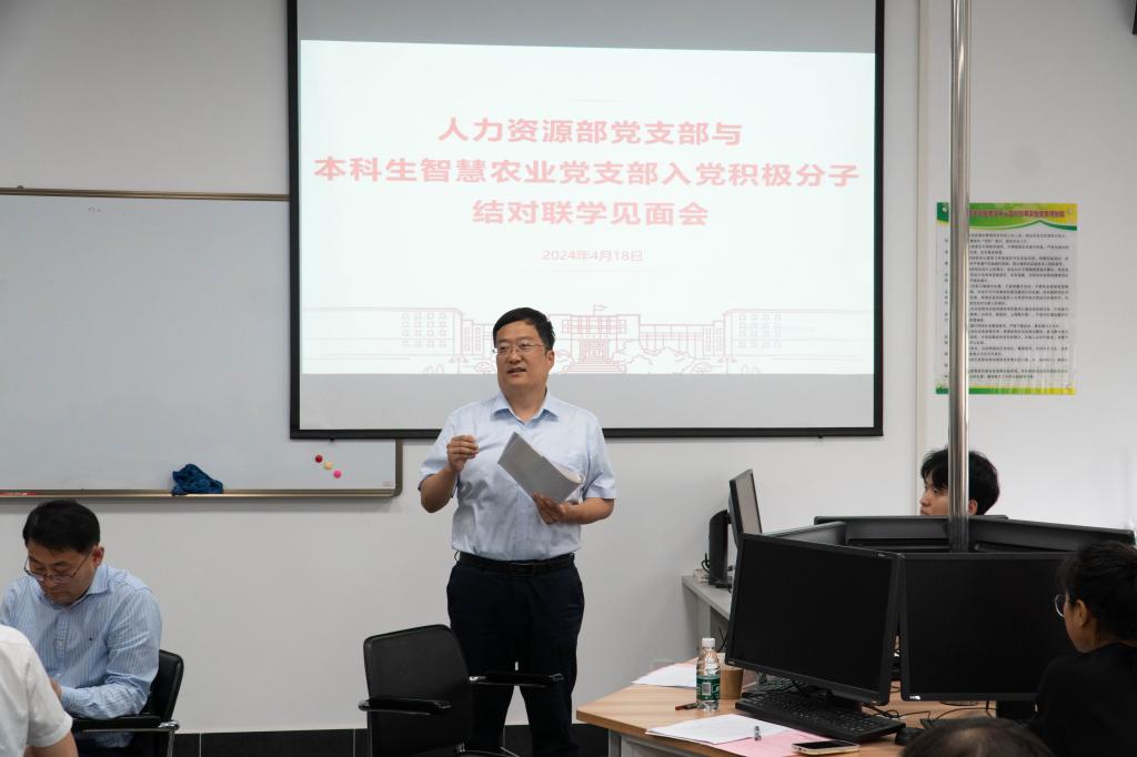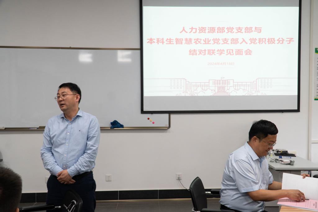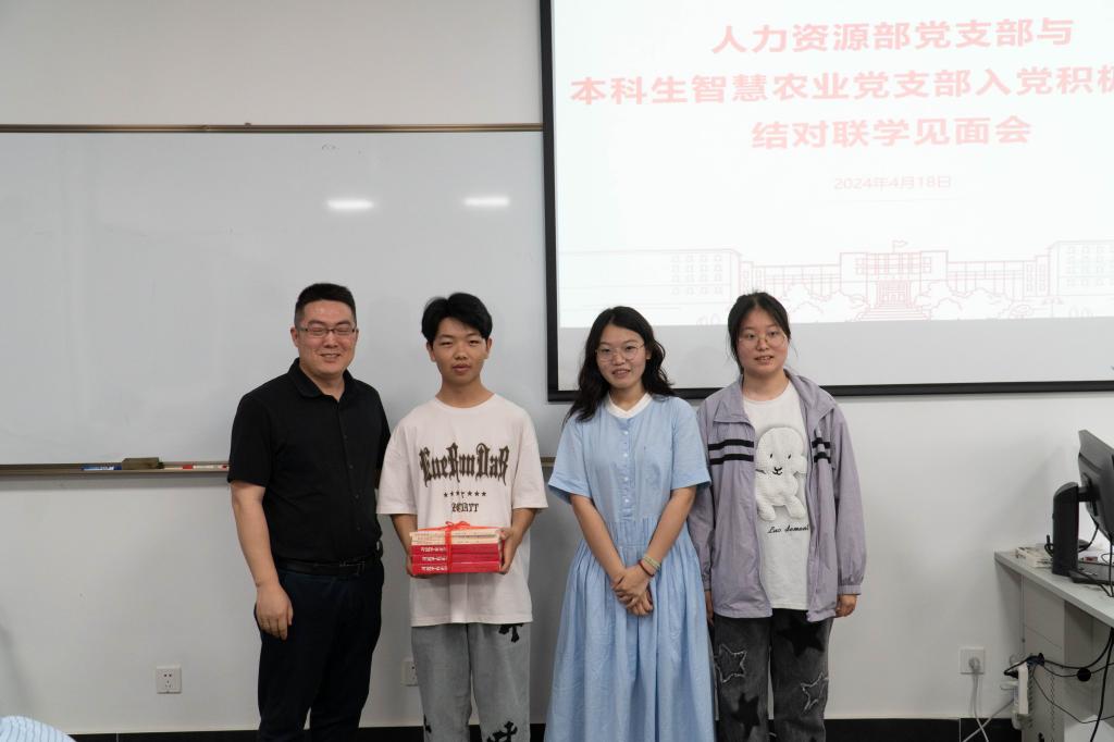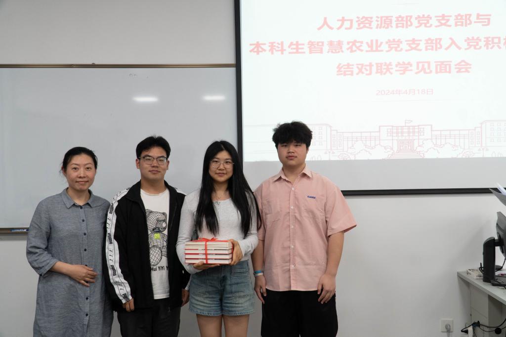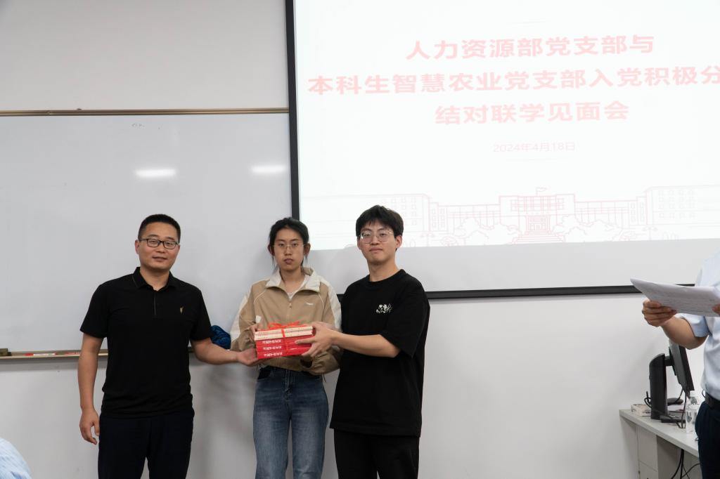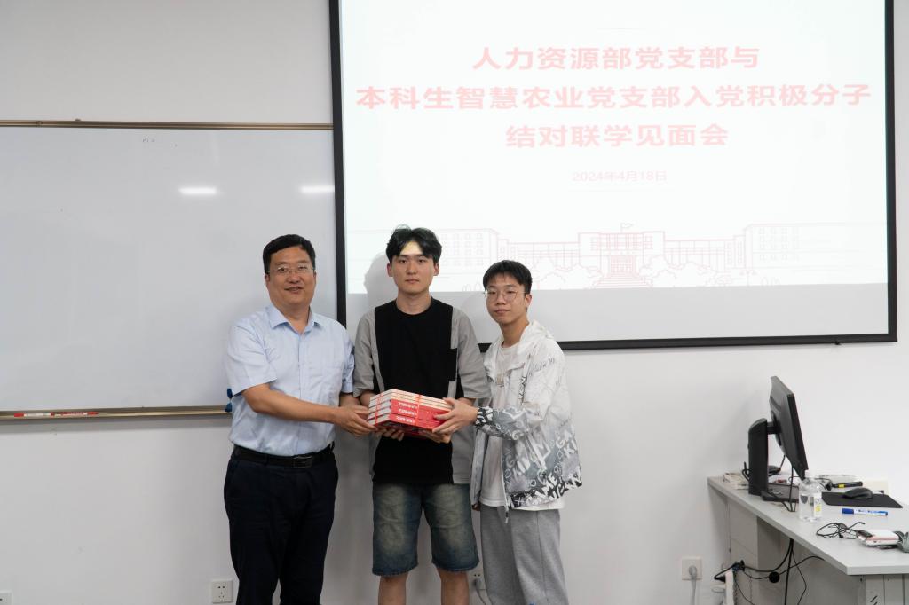 在智慧农业创新教室中,人力资源部副部长赵希庆代表支部党员亲切问候在场同学,一一介绍了支部成员与所指导的入党积极分子。各“红色导师”与入党积极分子们畅谈大学生活,并向同学们赠送《习近平在正定》、《党代会简史:从一大到二十大》等红色书籍,期待同学们与书为友,提升认识。赵希庆谈到,人力资源部党支部与智慧农业党支部结对共建是学校“党建质量源头提升工程”的工作内容,是切实推动教师党员发挥对入党积极分子的涵育功能、积极引导青年学生成长成才的重要举措。
