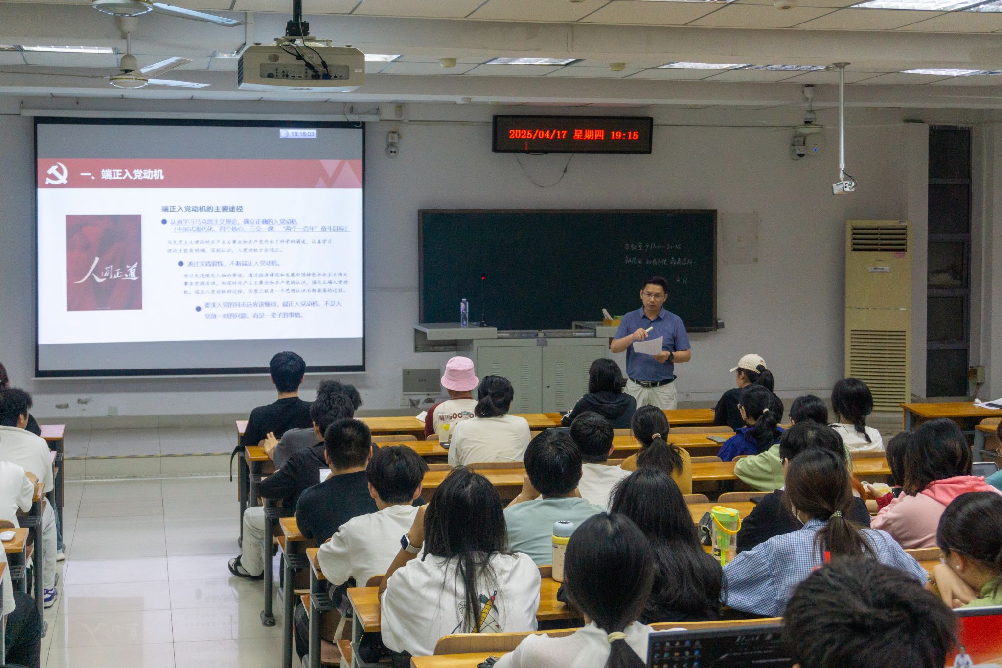 4月17日晚,学院第87期党校第三次线下党课在三教A205教室开展。学院党委副书记孙超讲授“以实际行动争做合格的共产党员”专题党课,引导120余名学员理解党员使命,筑牢思想根基。