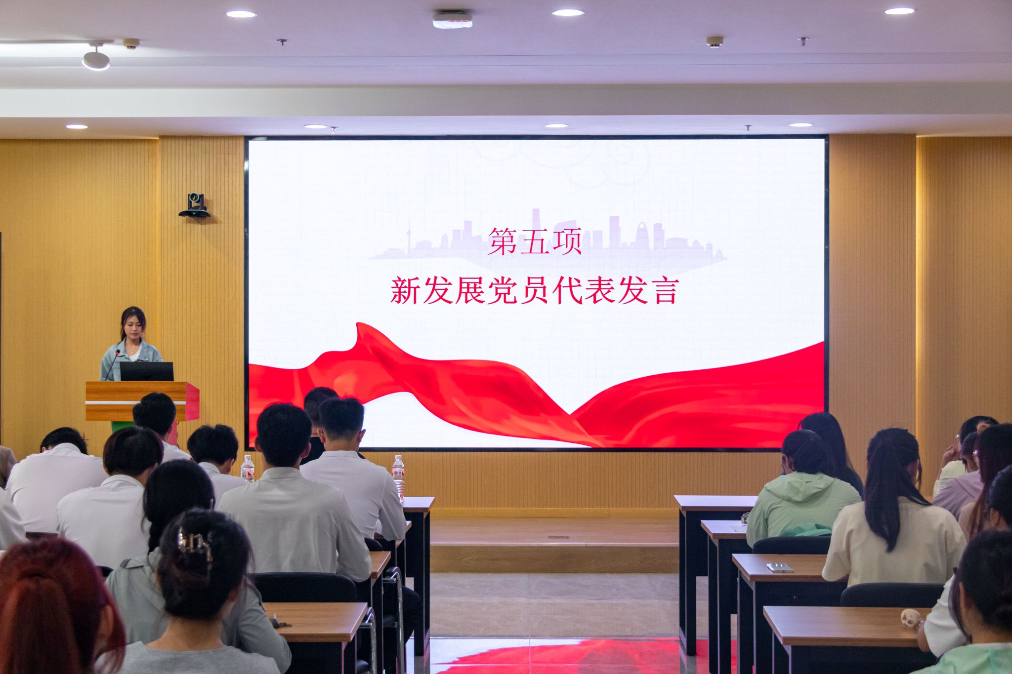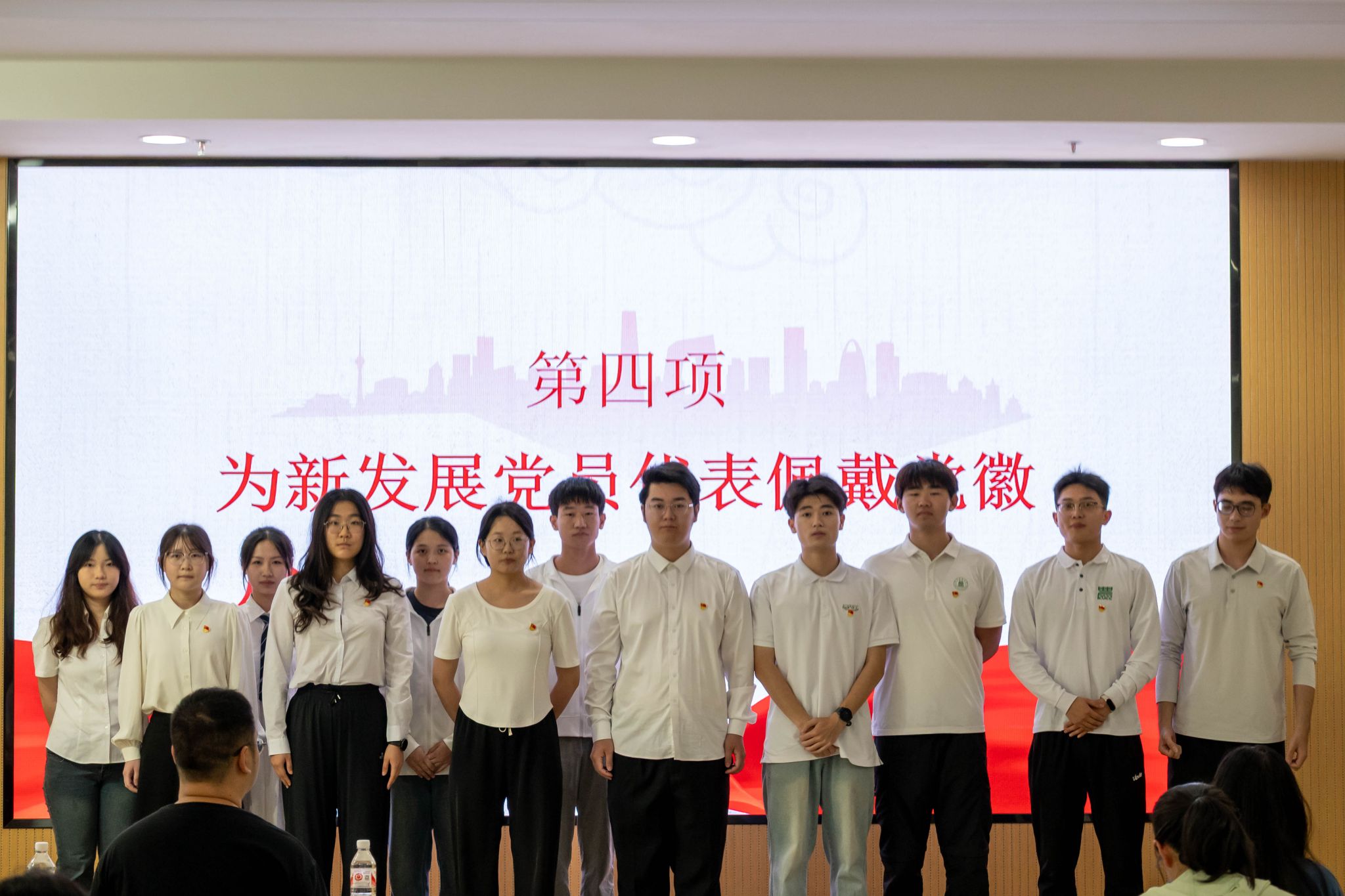 随后,党员代表为新发展党员佩戴党员徽章,传递党员力量,筑牢初心使命。新发展党员代表李雅欣上台发言。她深知今日的荣誉离不开党组织的培养与信任,将在今后的学习、工作和生活中,以党员标准严格要求自己,不断提高自身素质,为党和人民的事业贡献自己的力量。