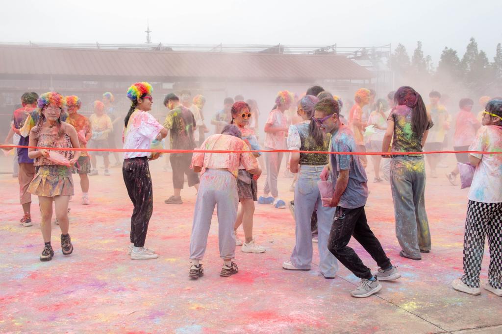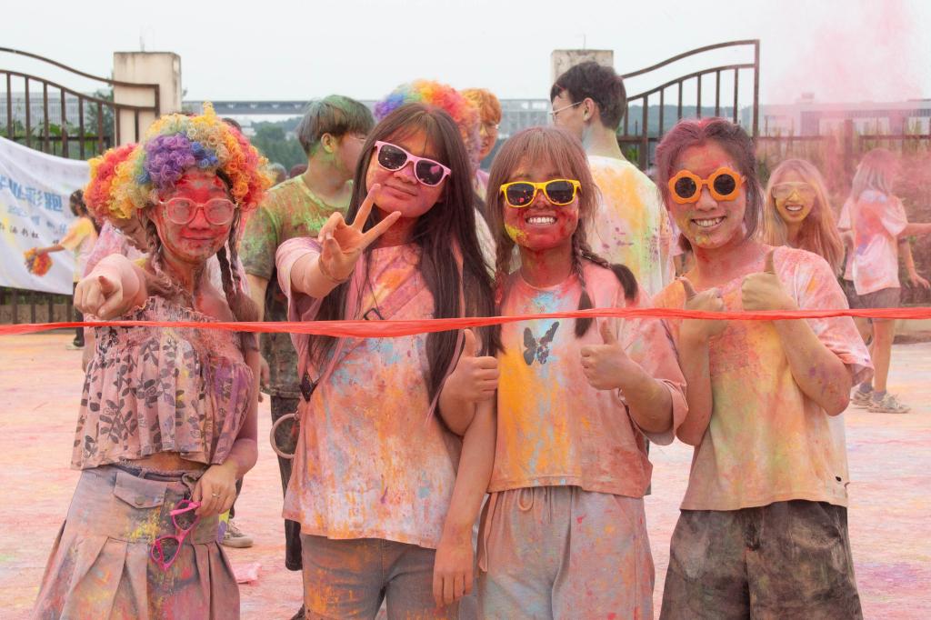 随着彩虹跑的进行,同学们陆陆续续到达终点。在这里,他们首先在海报背景布上签下自己的名字,接着逐一领彩虹粉末。随着跑团团负责人陈芳瑛一声令下,本届彩虹跑最令人期待的部分——“彩色大战”一触即发。伴随着激昂而欢快的音乐,同学们或头戴彩色爆炸头,或佩戴彩色墨镜,纷纷将自己手中的彩色粉末洒向他人。缤纷的玉米粉有些在空中散开,又四处飘落在“参战人员”的头发上、脸上、衣服上;有些则被“毫不留情”地砸向同学们的白色衣服上……到最后合影时,所有参加彩色大战的同学都仿佛被彩虹上了色,在镜头前定格下青春最绚丽肆意的模样。