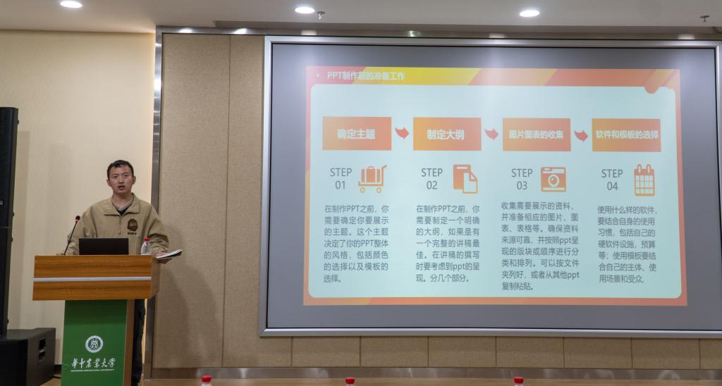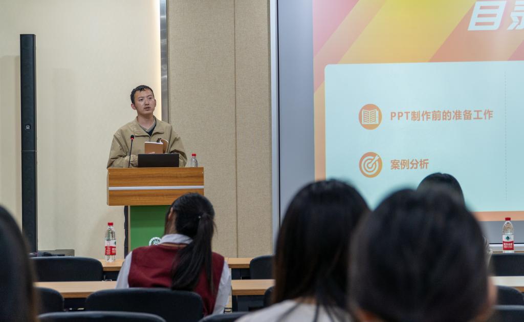 4月21日晚,第38 期“植科俊秀”训练营主题培训在第三综合楼A705报告厅进行,文法学院辅导员胡学谦以“简约不简单”为主题开展PPT制作培训,意在提高参与同学的PPT制作能力。