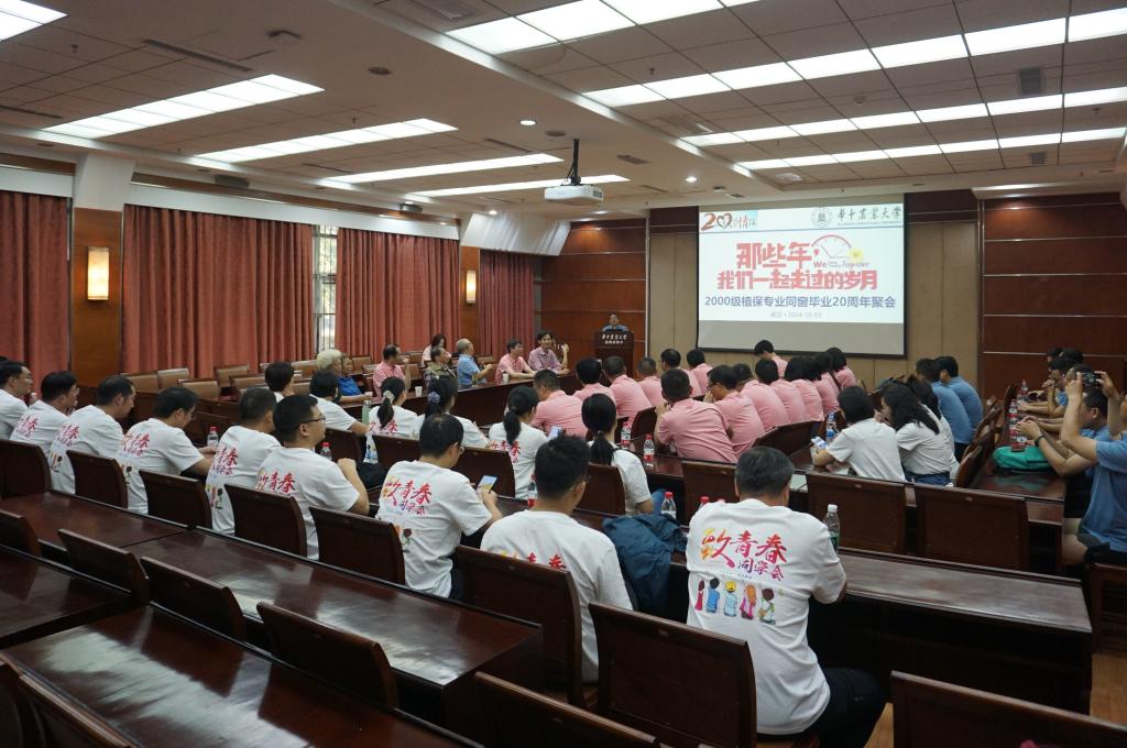 在植保2000级师生交流会中,学院副院长王满囷教授介绍学院和学科发展情况,他希望校友们常回来看看。会上,校友们畅谈过去二十年生活、工作等方面的成长。伍箴勇校友讲述他的科研经历,他特别提到在今年九月份入学攻读张启发院士的博士,令各位校友深感振奋。陈飞校友则用一曲《浪漫樱花》把现场气氛推向高潮。侯明生、荣秀兰、黄俊斌、成国英、李国庆、王春、周兴苗等教师代表依次发言,表达对校友们的美好祝愿。