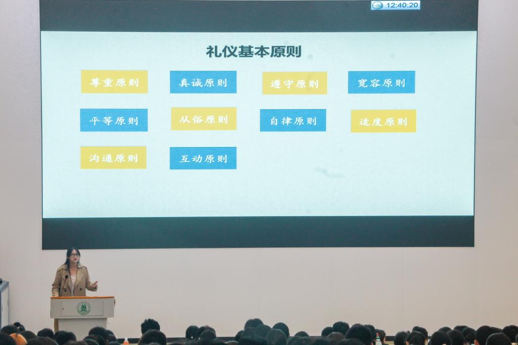 大会伊始,刘思以“塑造优雅形象,展现青春风采”为主题展开大学生礼仪介绍,向同学们讲解了“尊重原则”、“真诚原则”等礼仪的十个原则,并通过现场示范教授同学们“进门礼仪”、“握手礼仪”等常见社交行为礼貌规范。“如何向老师发邮件、发短信、打电话?”刘思提出了三点建议:第一,注意敬称、问候用语等格式,不可过于随意,需简练,尽量使用书面用语;第二,梳理好事情的三要素时间、地点、人物,提炼沟通事项的重要信息;第三,注意沟通时间,以8-12点和14-18点为宜,其他时间、节假日,无紧急情况不建议使用电话沟通。