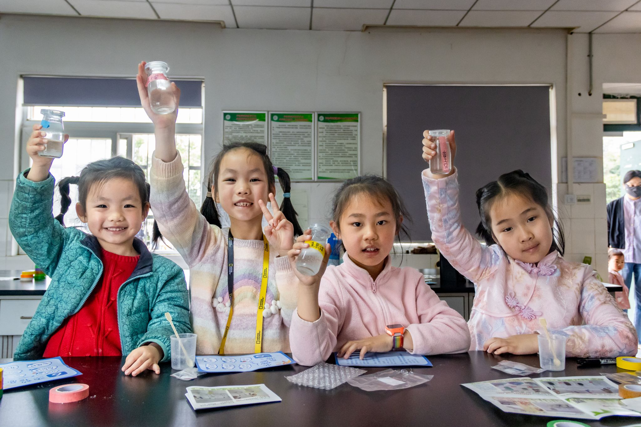 气象文化的传承在动手实践中悄然实现。在志愿者的指导下,孩子们化身为“小小气象员”,亲手制作属于自己的天气瓶。“快看,我的天气瓶变浑啦!”一位小朋友自豪地向同伴展示自己的作品。
