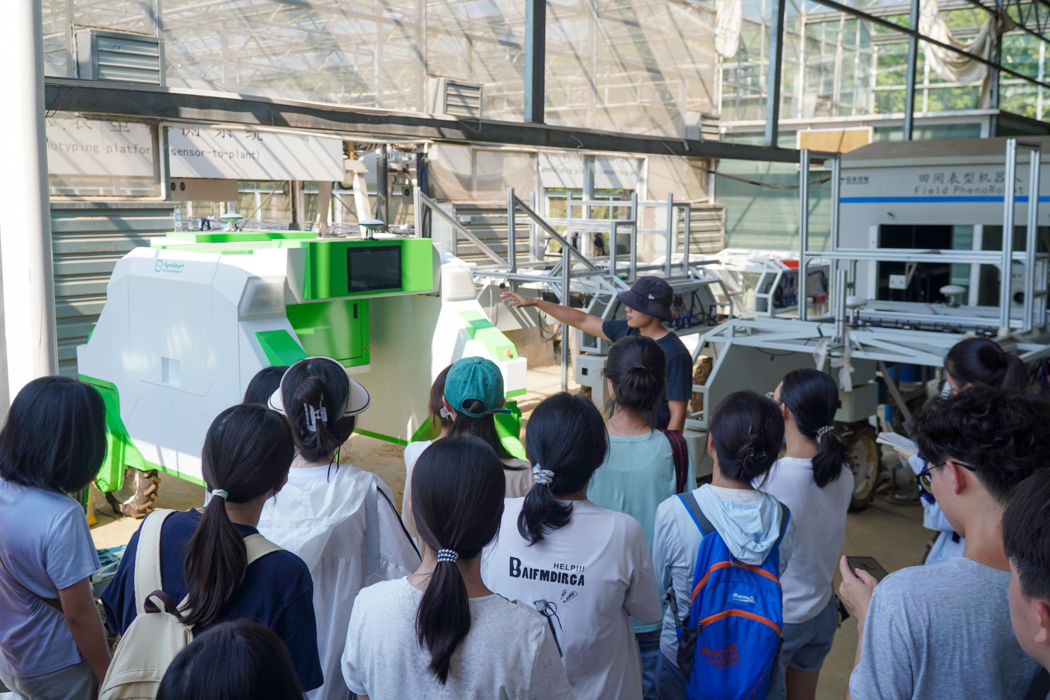 随后,杨蒙引导新生参观了八套暗室设备,说明其在避免外界光污染、精准获取植物形态数据方面的优势,并通过相机、轨道与旋转台的协同运作,为基因功能解析提供表型支撑。在表型机器人展区,他介绍了机器人的移动平台与多源传感采集模块,指出智慧农业专业涵盖领域广泛,仍有诸多前沿方向有待深入探索。此外,他还简要阐述了影像室、高光谱暗室及数字烤种机等设施的核心功能,包括植物内部结构解析和种子成分分析等应用。