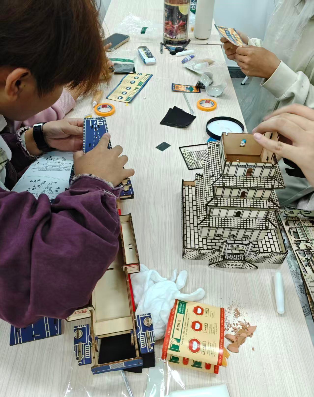 “一叶知秋,一板成森”活动,同学们以废纸箱成基座、咖啡渣作土地、落叶为点缀,亲手搭建秋意微缩世界。废物利用,让环保理念与美育实践深度融合,赋予平凡旧物新生意义。