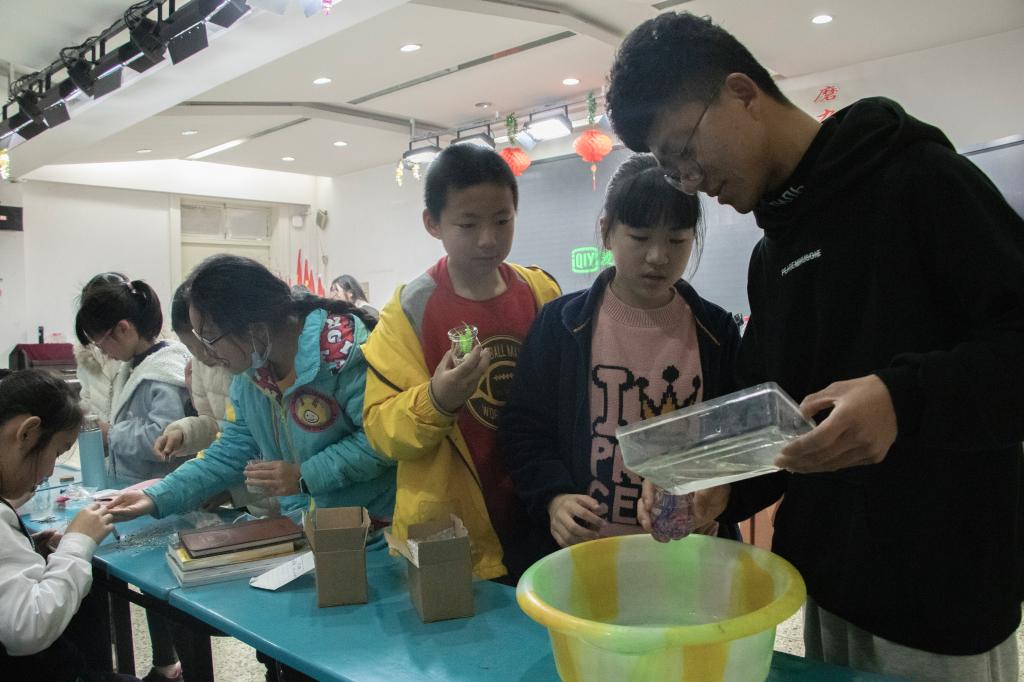 随后,谭草意播放生态瓶制作视频,详细讲解了制作步骤。工作室成员为小朋友们分发了制作生态瓶的材料,并予以指导。在工作人员的指导下,小朋友们小心翼翼地撕开包装袋,兴奋地将小石头铺入瓶底,再用镊子将水草等装饰物细心的摆放到瓶子里,最后向瓶内灌入清水,滴入适量营养液,至此,一个简易美观的生态瓶就制作成功了。