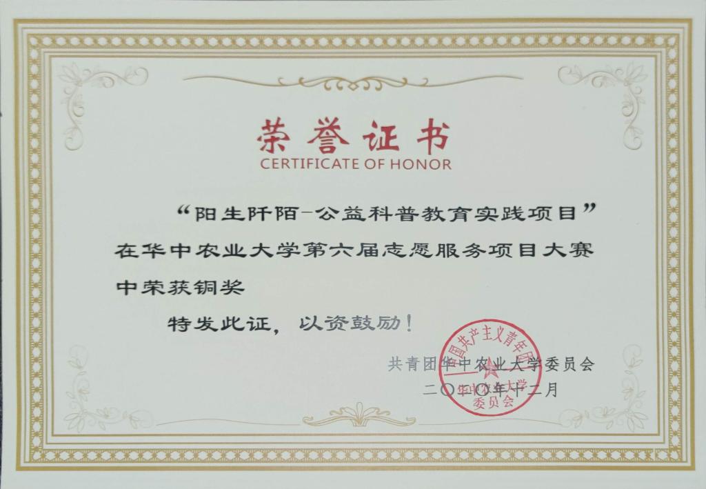 近日,我校第六届青年志愿服务项目大赛评选结果公布,我院组织申报的3个项目获得1金、1银、1铜的佳绩,学院获得大赛优秀组织奖。其中我院“点亮星空”本禹志愿服务队“守望邻里,农耕文化进社区”项目获得大赛金奖,英国365集团“小宇宙”支教团“种下梦想的种子,放飞田埂上的梦”项目获得大赛银奖,三田创新工作室“阳光阡陌-公益科普教育实践项目”获得铜奖。