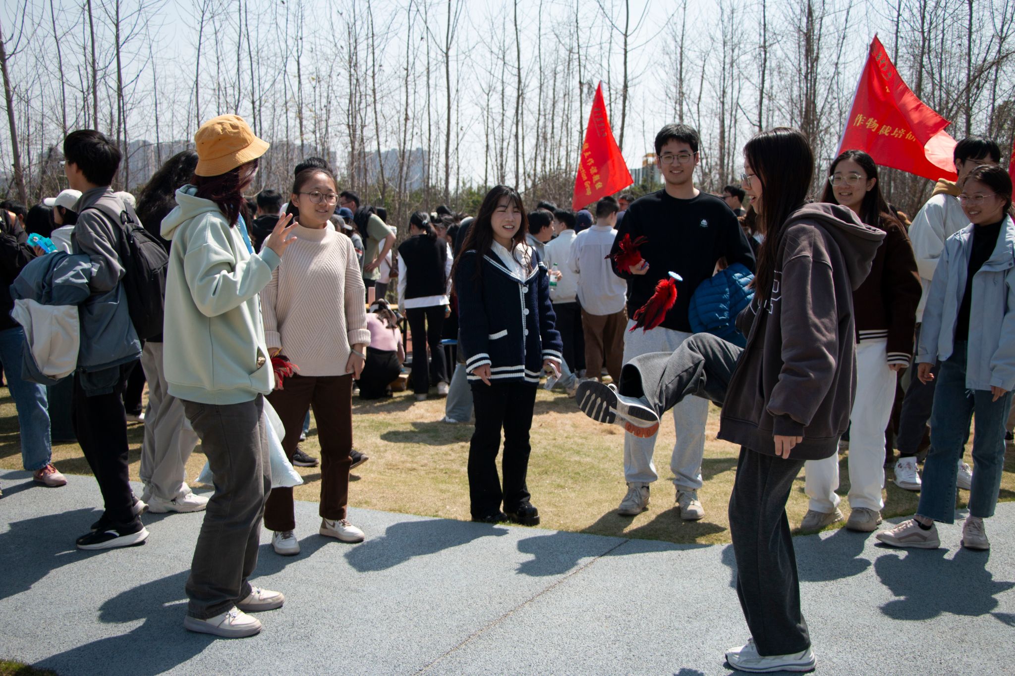 各支队伍从第三综合楼出发,意气风发地徒步前进。试验田的油菜花交织成绚丽的“春日锦缎”。沿着油菜花田继续前行,到达乐乐园后,趣味运动吸引了众人的参与。苏超老师同学们一起挑战踢毽子,现场气氛十分热烈。苏老师表示,这是他第一次参加“狮山长走”活动,能和学生们一起暂时放下实验室的工作,享受这春暖花开的美好时光,体验非常棒他还期待在秋季也能举办类似的活动一起欣赏校园不同时节的风景。